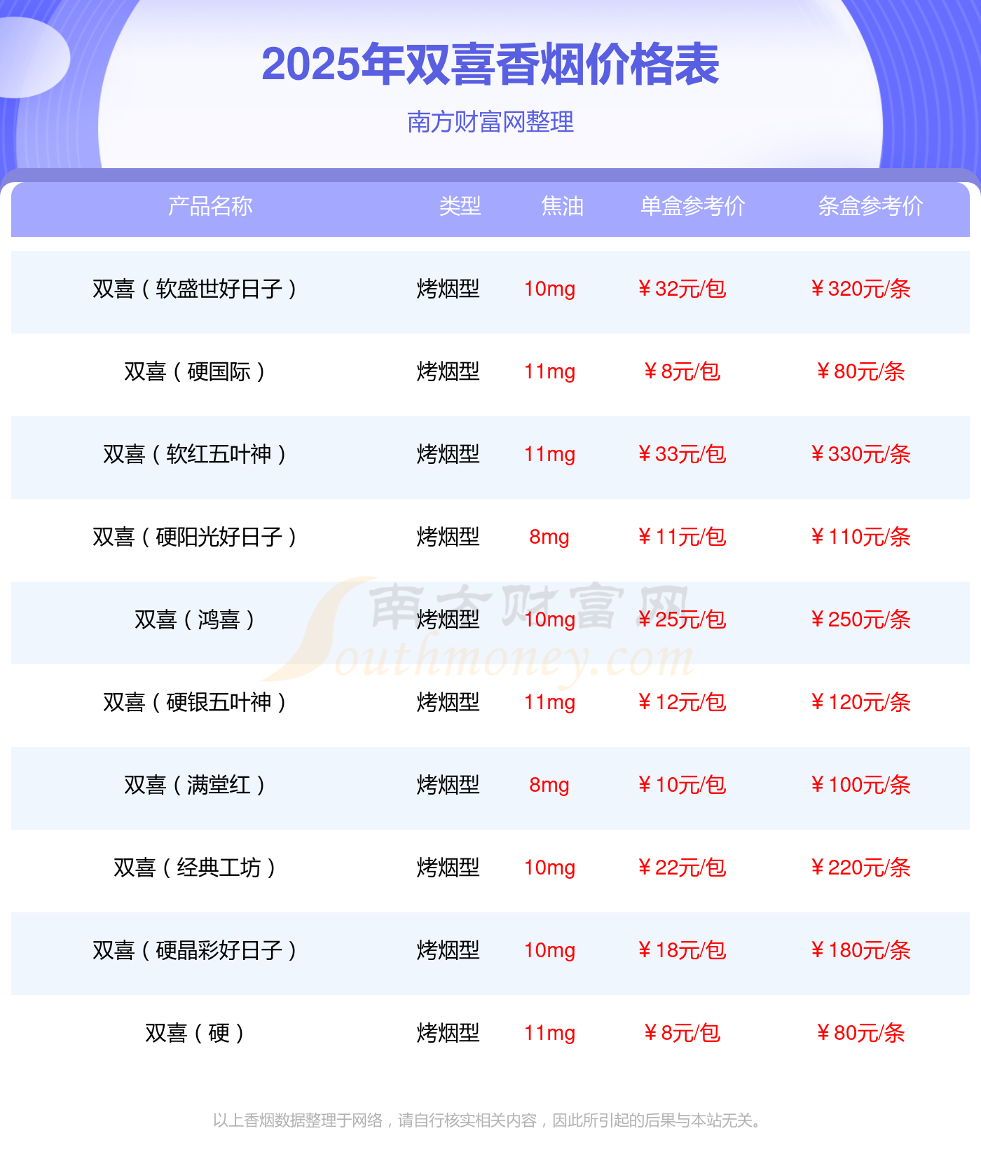 以上香煙數(shù)據(jù)整理于網(wǎng)絡(luò),請自行核實相關(guān)內(nèi)容,因此所引起的后果與本站無關(guān)。
