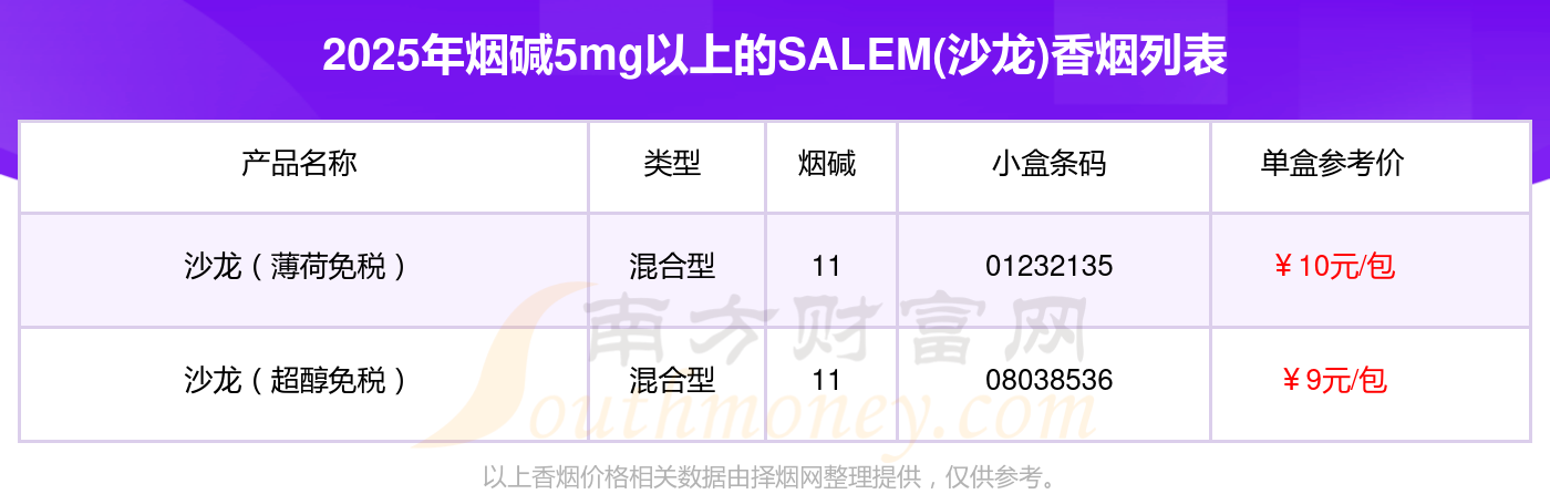 沙龍(薄荷免稅)參考價10元/包、沙龍(超醇免稅)參考價9元/包等。
