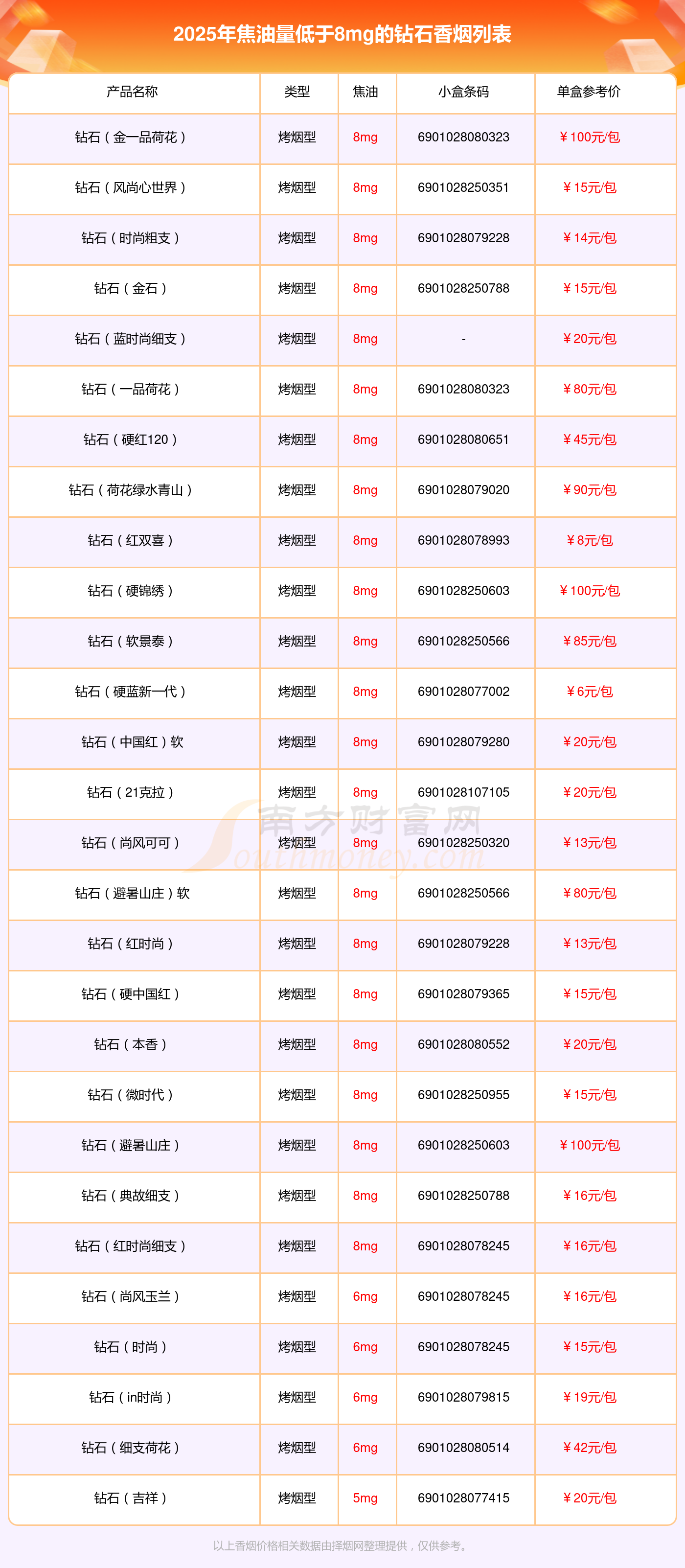 擇煙網(wǎng)為大家盤點了焦油量低于8mg的鉆石香煙,有以下這些: