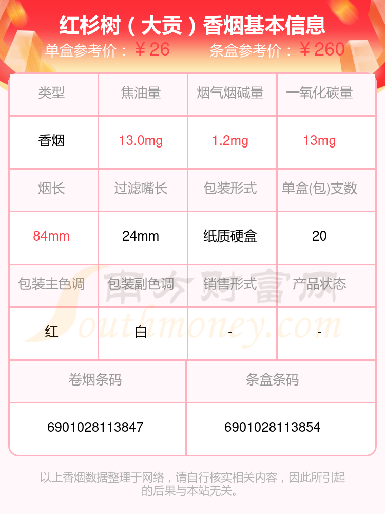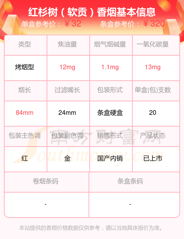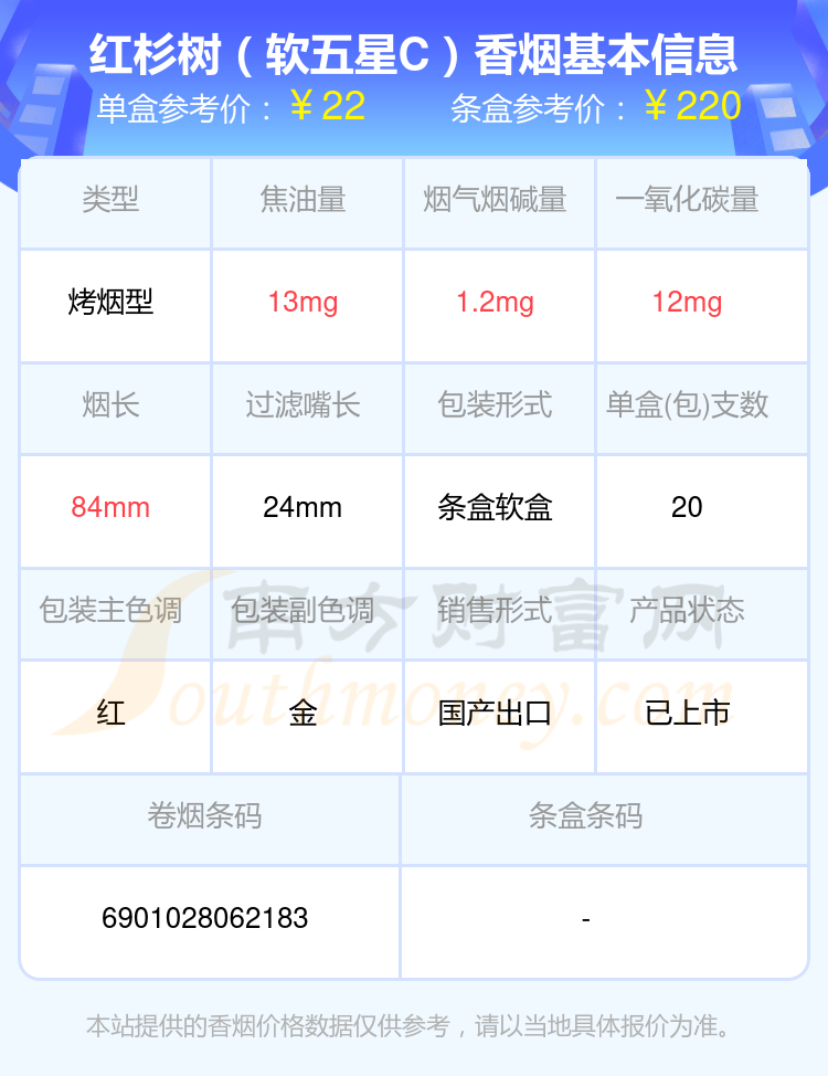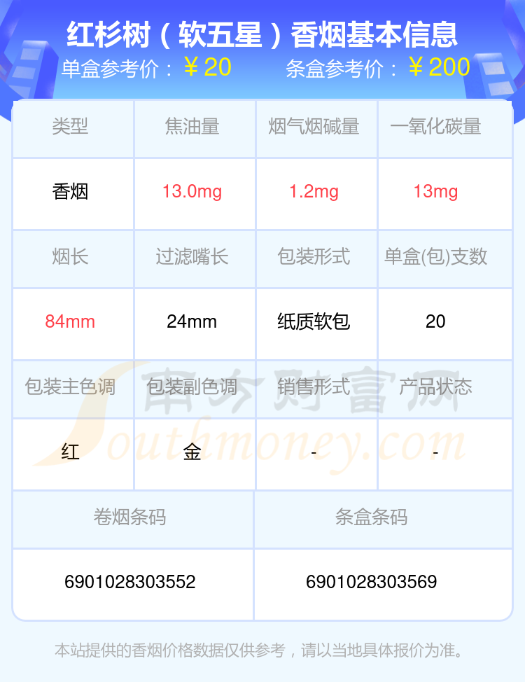 紅杉樹是江蘇四大名煙之一,紅杉樹以“紅紅火火紅杉樹,紅紅火火紅中國”、“紅紅火火紅杉樹,紅紅火火好生活”為品牌形象,包裝具有傳統(tǒng)特色。紅杉樹連續(xù)多年被評(píng)為行業(yè)名優(yōu)卷煙,并進(jìn)入全國煙草百牌號(hào)目錄,其中紅杉樹軟五星是較為人熟知和喜愛的單品,憑借紅杉樹一貫紅火的設(shè)計(jì)和出色的品質(zhì),是20元左右性價(jià)比不錯(cuò)的卷煙之一。