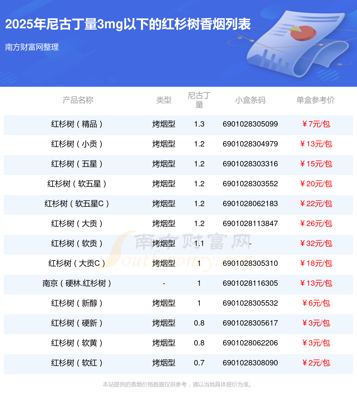 紅杉樹香煙尼古丁量3mg以下的煙有紅杉樹(精品)、紅杉樹(小貢)、紅杉樹(五星)、紅杉樹(軟五星)、紅杉樹(軟五星C)、紅杉樹(大貢)、紅杉樹(軟貢)、紅杉樹(大貢C)、南京(硬林.紅杉樹)、紅杉樹(新醇)等,具體價格如下: