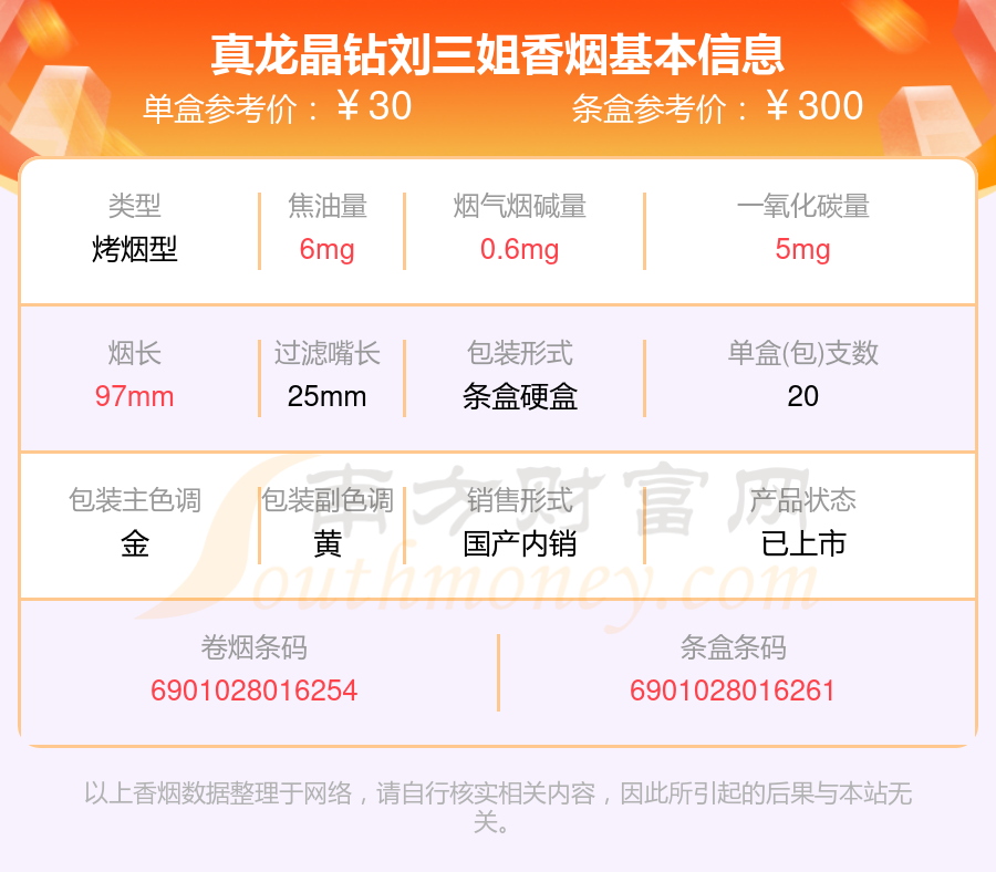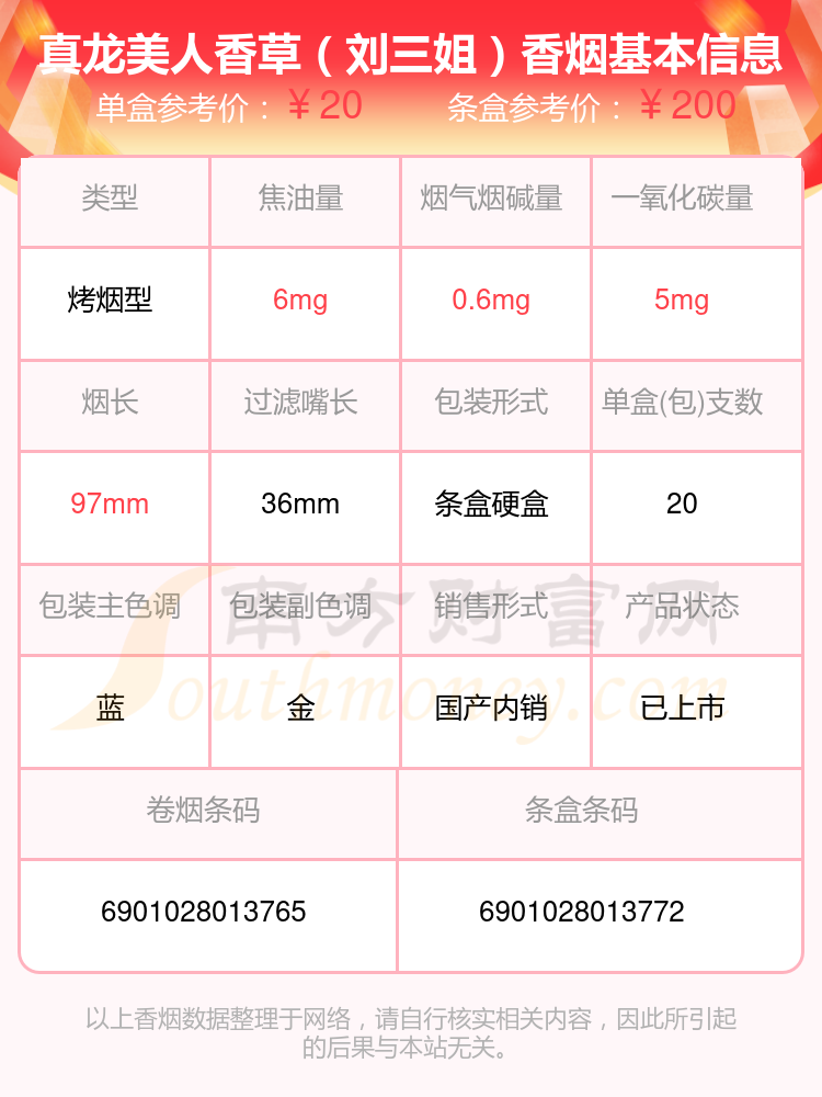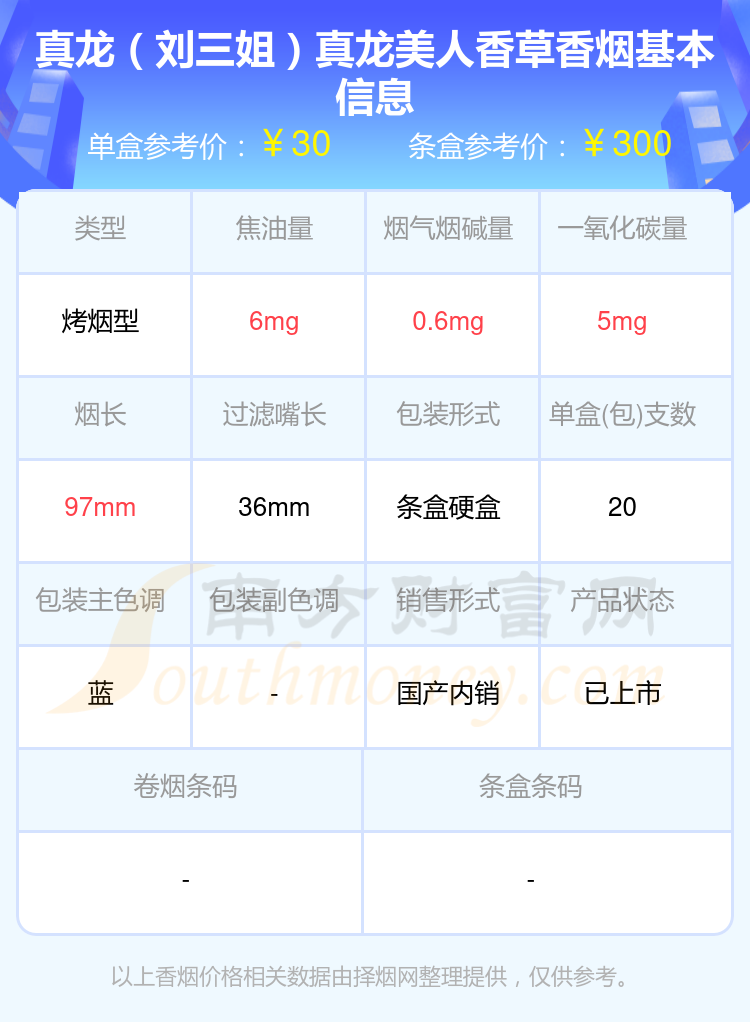 劉三姐香煙煙堿10mg以下的煙有真龍晶鉆劉三姐、真龍美人香草(劉三姐)、真龍(劉三姐)真龍美人香草等,具體價(jià)格如下: