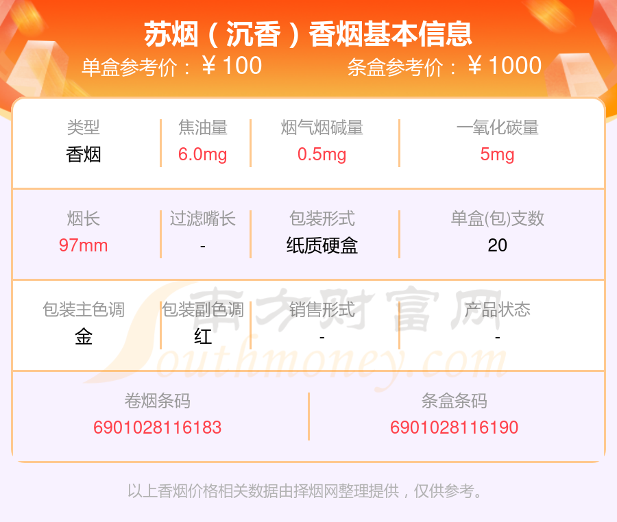 蘇煙(沉香)參考價100.0元/包、蘇煙(靈韻細支)參考價55元/包等。