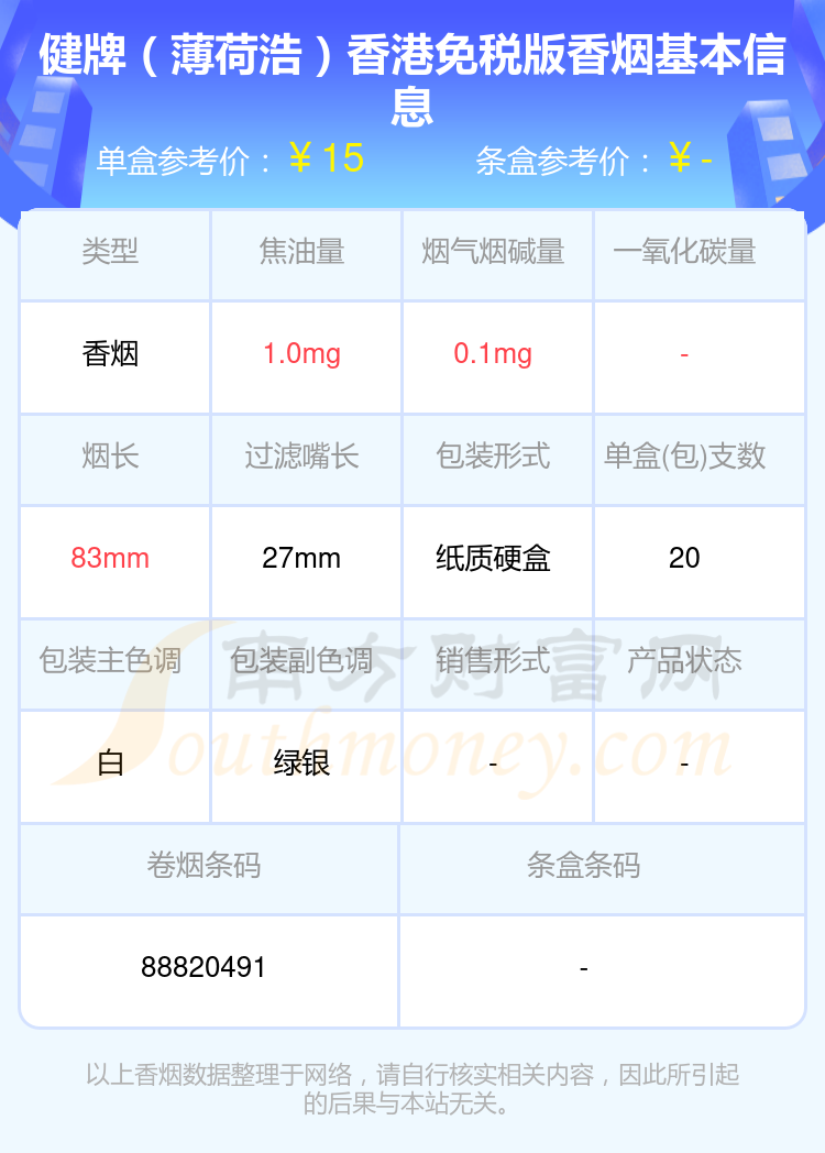 KENT(健牌)香煙尼古丁低于0.3mg的煙有建牌(HD4)、健牌(薄荷1)、健牌(薄荷浩)香港免稅版、建牌(薄荷黃冰1)、健牌(HD白1)、建牌(薄荷紫冰1)、建牌(薄荷細(xì)支1)、健牌(浩白)、健牌(白免稅)等,詳細(xì)價(jià)格如下: