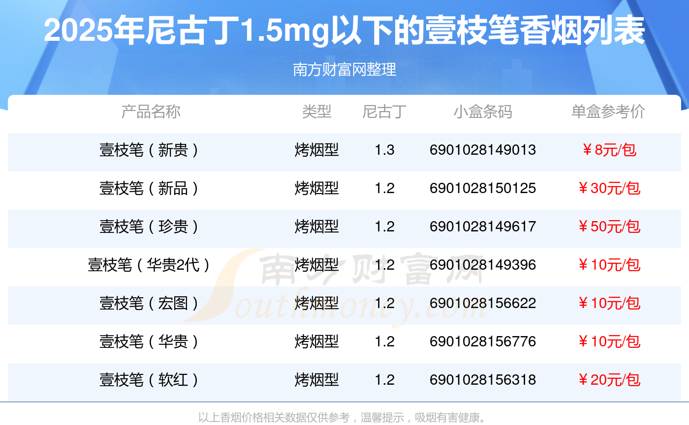 擇煙網(wǎng)為大家盤點了壹枝筆香煙尼古丁1.5mg以下的,分別有壹枝筆(新貴)、壹枝筆(新品)、壹枝筆(珍貴)、壹枝筆(華貴2代)、壹枝筆(宏圖)、壹枝筆(華貴)、壹枝筆(軟紅)等,具體價格如下: