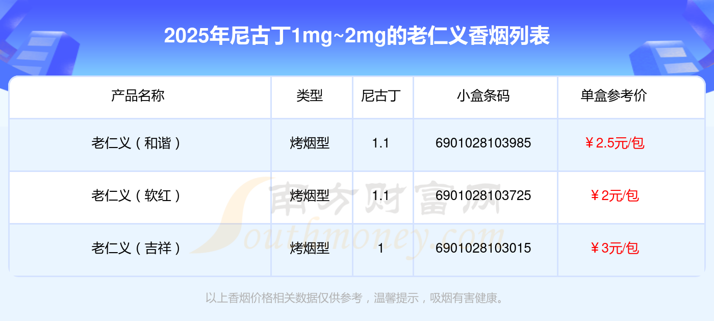 擇煙網(wǎng)為大家盤點了尼古丁1mg~2mg的老仁義香煙,有老仁義(和諧)、老仁義(軟紅)、老仁義(吉祥)等,詳細(xì)價格如下: