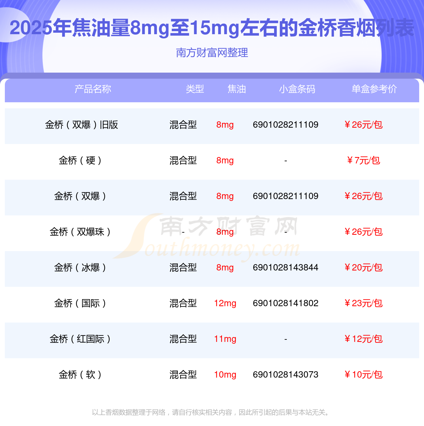 金橋(雙爆)舊版參考價26.0元/包、金橋(硬)參考價7元/包、金橋(雙爆)參考價26元/包、金橋(雙爆珠)參考價26元/包、金橋(冰爆)參考價20元/包、金橋(國際)參考價23.0元/包、金橋(紅國際)參考價12元/包、金橋(軟)參考價10.0元/包等。