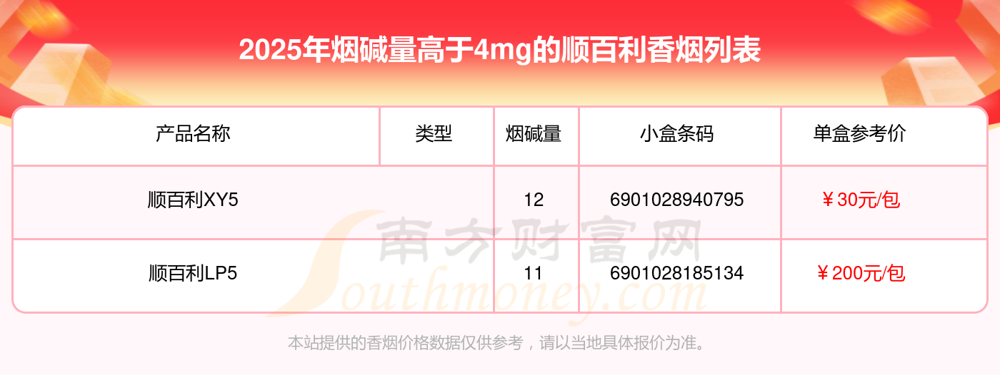 擇煙網(wǎng)為大家盤點(diǎn)了順百利香煙煙堿量高于4mg的煙,有以下這些: