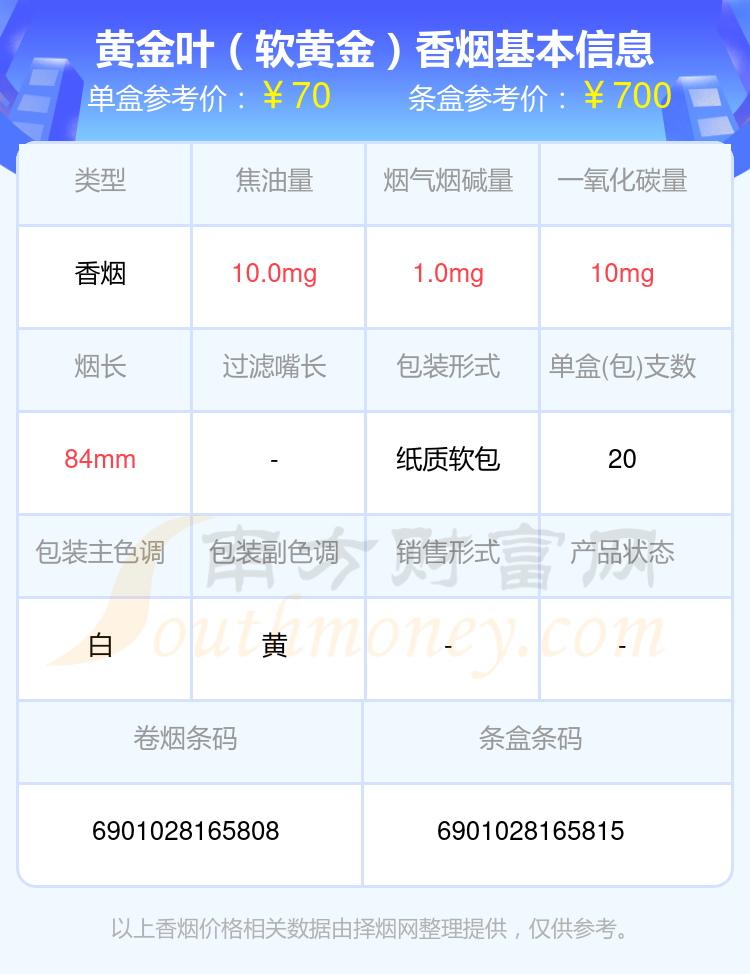 擇煙網(wǎng)為大家盤點(diǎn)了黃金葉香煙50~80元左右的,分別有黃金葉(小天葉)、黃金葉(小天葉紅旗渠)、黃金葉(軟黃金)、黃金葉(天尊)、黃金葉(上河圖)、黃金葉(云臺(tái)山)、黃金葉(三門峽)、黃金葉(洛陽天香)、黃金葉(洛陽牡丹細(xì)支煙)、黃金葉(天香細(xì)支)等,詳細(xì)價(jià)格如下: