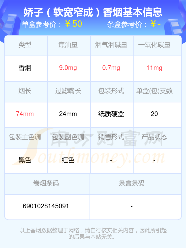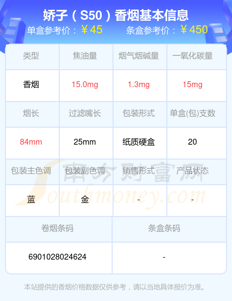 嬌子香煙10到50元的煙分別有嬌子(寬窄如意保濕版)參考價50.0元/包、嬌子(軟黃天子)參考價50.0元/包、嬌子(青海湖青稞酒香)參考價50.0元/包、嬌子(喜馬拉雅)參考價50.0元/包、嬌子(寬窄如意)參考價50.0元/包、嬌子(軟寬窄成)參考價50.0元/包、嬌子(寬窄如意細支)參考價50.0元/包、嬌子(S50)參考價45.0元/包、嬌子(夢幻九寨溝)參考價45.0元/包、嬌子(盛世天嬌)參考價42.0元/包等。