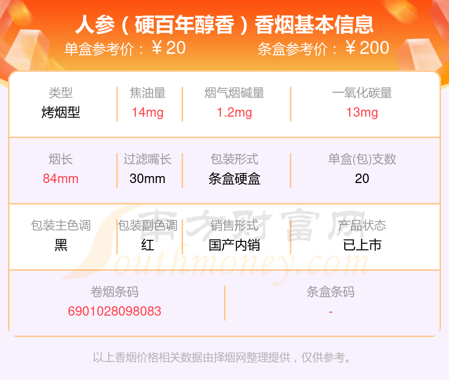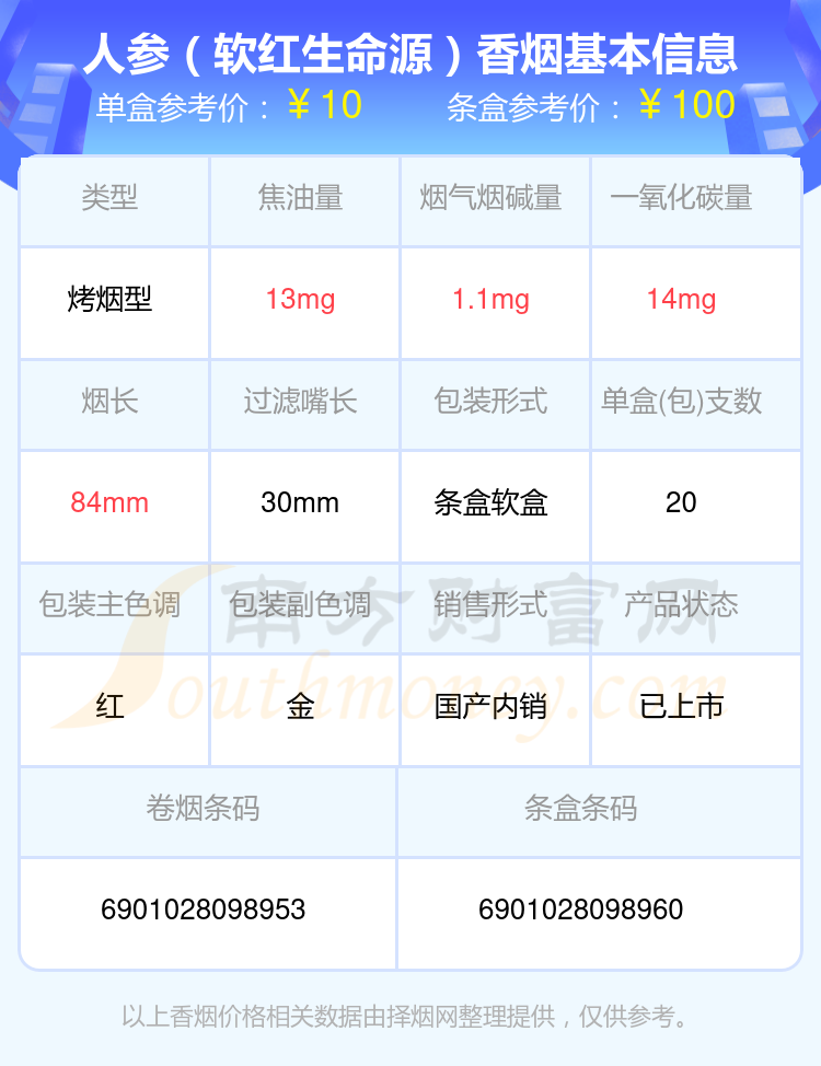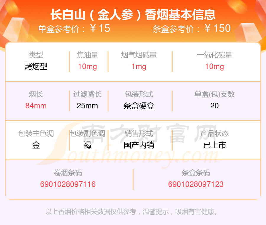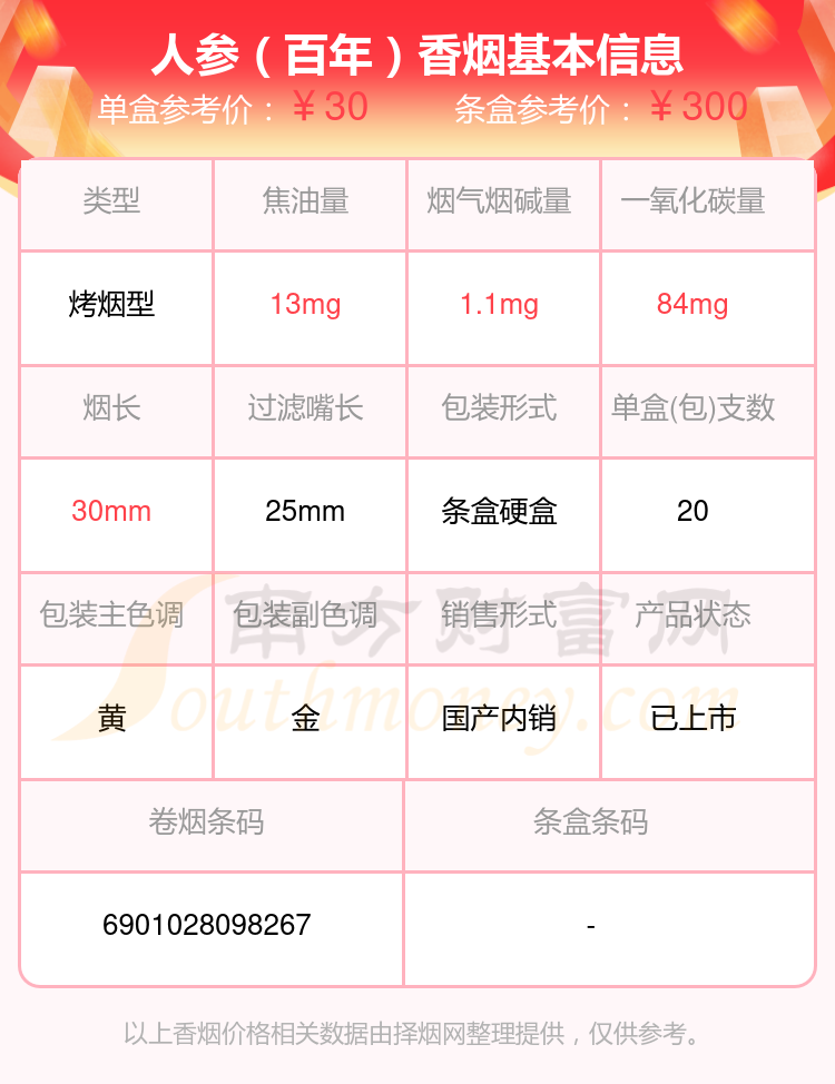 擇煙網為大家盤點了10-50元左右的人參香煙,分別有人參(VIP)參考價50元/包、人參(百年)參考價30元/包、人參(陽光)參考價20元/包、人參(硬百年醇香)參考價20元/包、長白山(黃人參)參考價16元/包、長白山(金人參)參考價15元/包、長白山(紅人參)參考價11元/包、人參(軟紅生命源)參考價10元/包等。