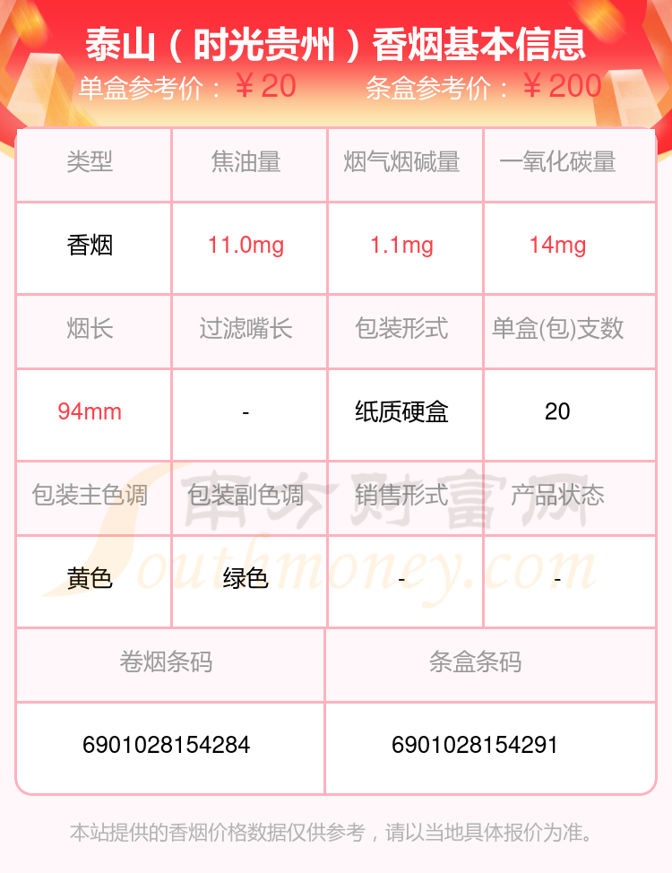泰山(時光貴州)香煙網友評分:口味評分為10,外觀評分為9,性價比評分為10,綜合得分為9.7。