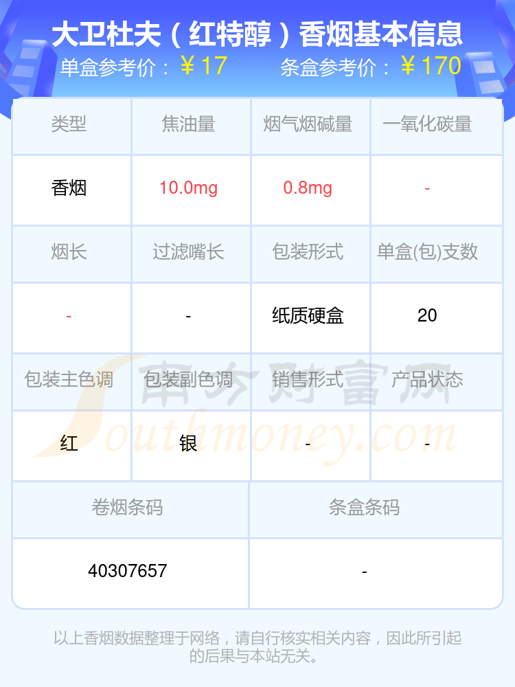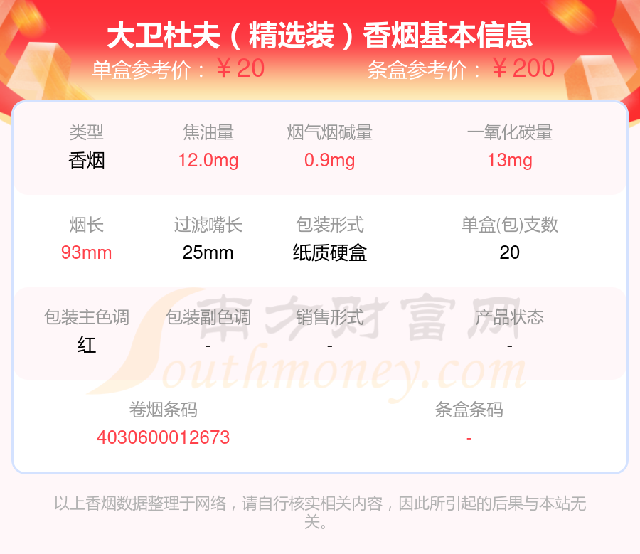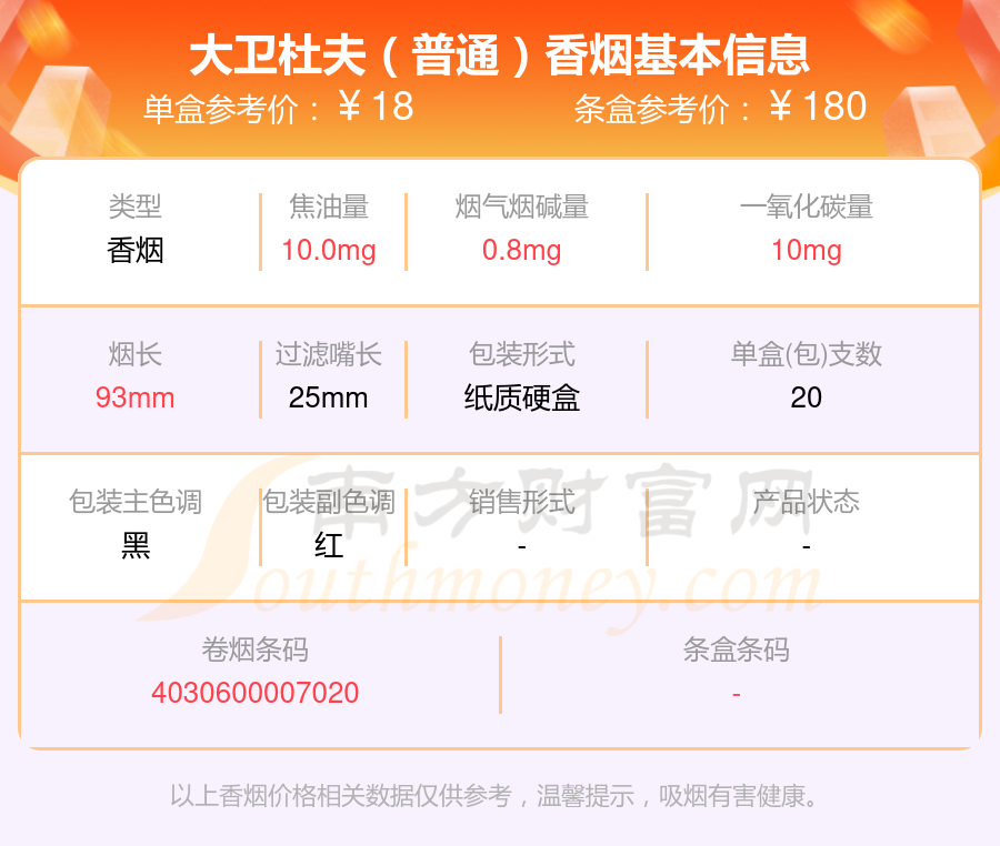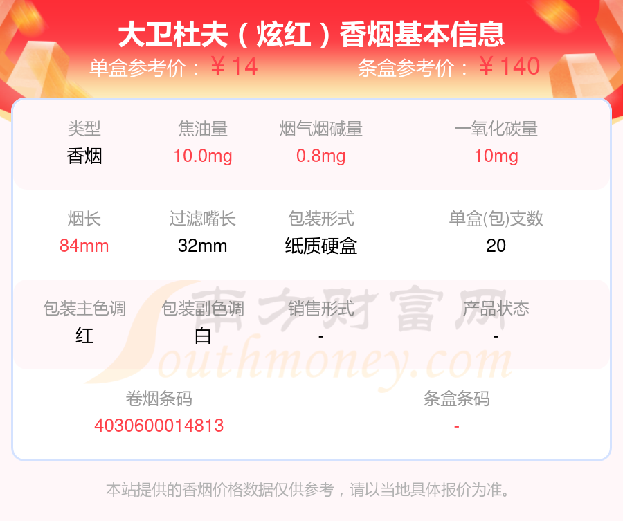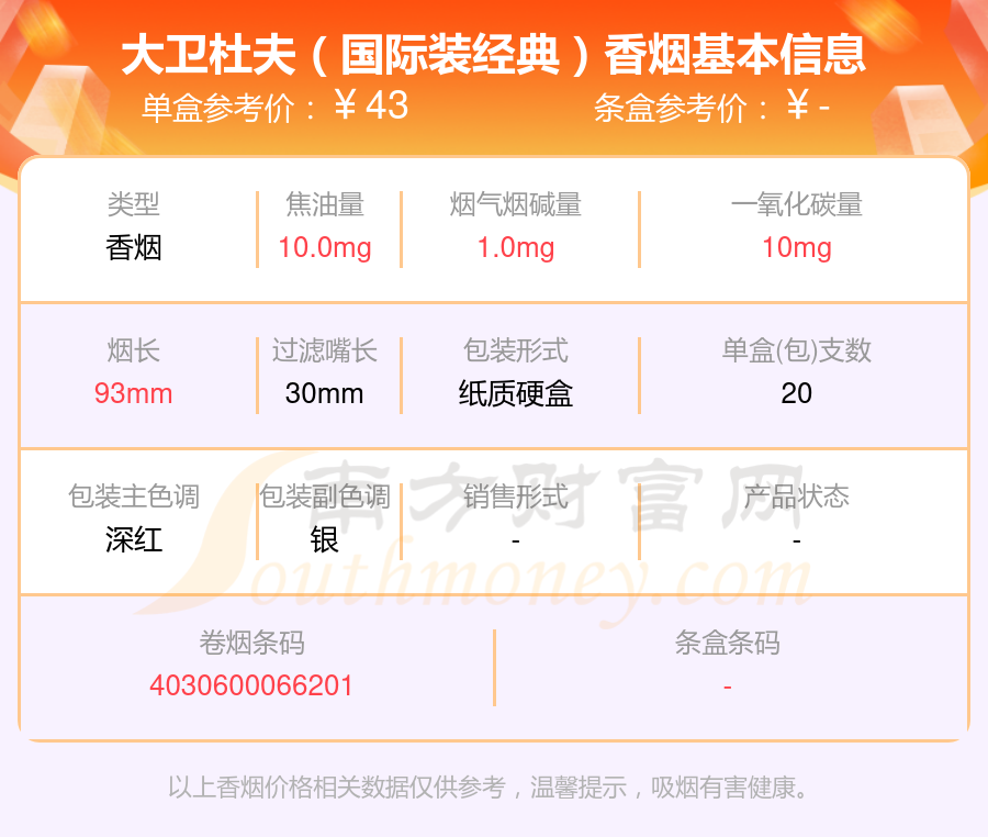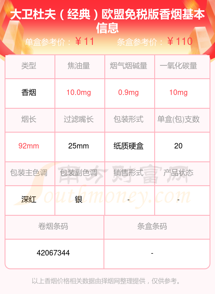 大衛(wèi)杜夫(炫紅國際版)參考價40.0元/包、大衛(wèi)杜夫(精選裝)參考價20.0元/包、Davidoff(炫紅國際版)參考價40元/包、大衛(wèi)杜夫(經(jīng)典)歐盟免稅版參考價11.0元/包、大衛(wèi)杜夫(炫紅)參考價14.0元/包、大衛(wèi)杜夫(經(jīng)典)中版參考價23.0元/包、大衛(wèi)杜夫(國際裝經(jīng)典)參考價43.0元/包、大衛(wèi)杜夫(紅特醇)參考價17.0元/包、大衛(wèi)杜夫(普通)參考價18.0元/包、大衛(wèi)杜夫(炫黑)參考價40.0元/包等。