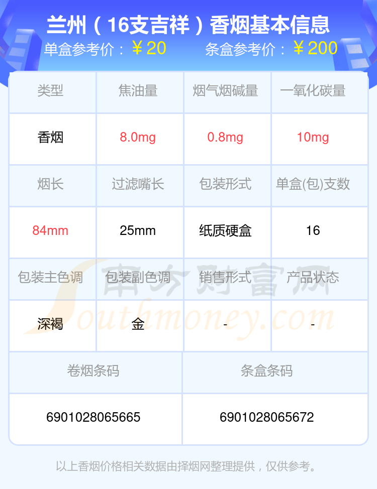 蘭州(16支吉祥)單盒參考價(jià):20元