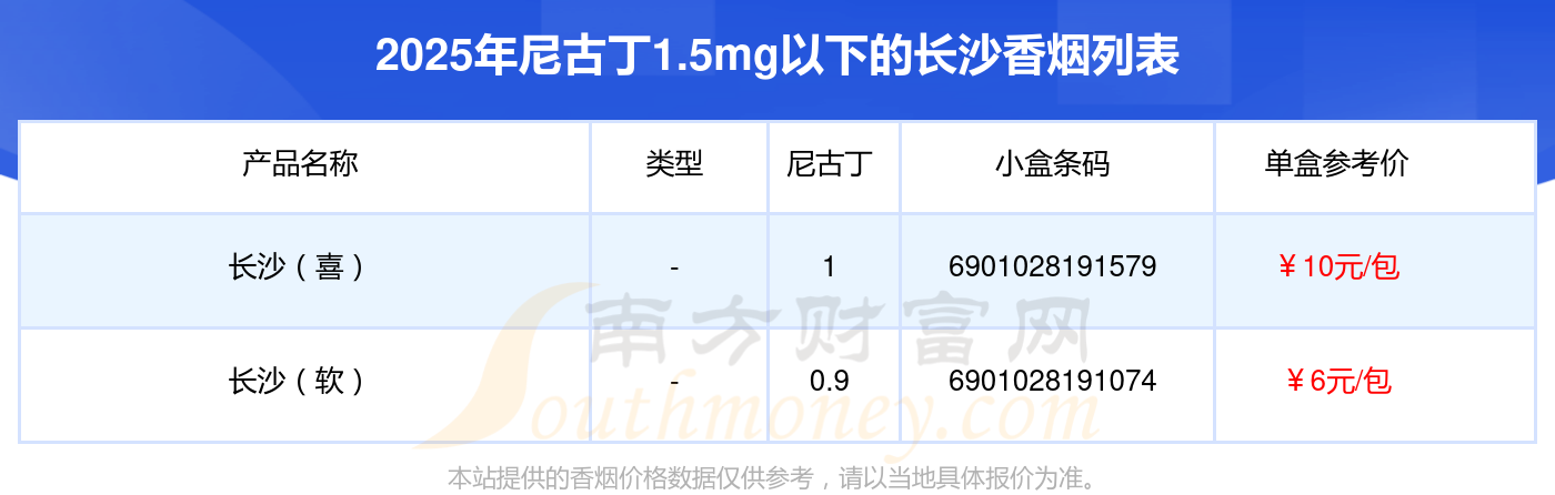 長沙香煙尼古丁1.5mg以下的煙分別有長沙(喜)參考價10元/包、長沙(軟)參考價6元/包等。