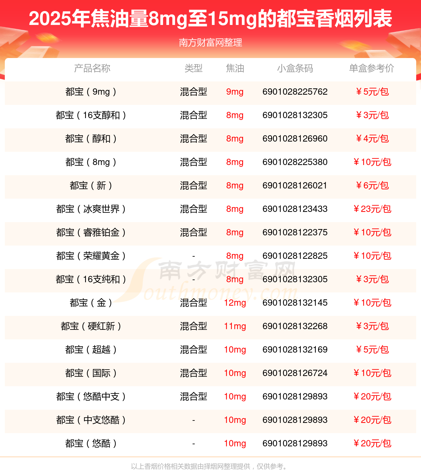 擇煙網(wǎng)為大家盤點(diǎn)了都寶香煙焦油量8mg至15mg的,分別有都寶(9mg)、都寶(16支醇和)、都寶(醇和)、都寶(8mg)、都寶(新)、都寶(冰爽世界)、都寶(睿雅鉑金)、都寶(榮耀黃金)、都寶(16支純和)、都寶(金)等,詳細(xì)價(jià)格如下: