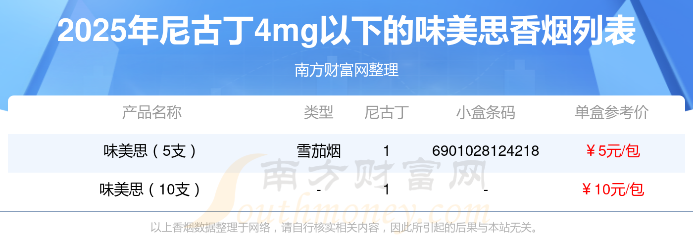 擇煙網(wǎng)為大家盤點了味美思香煙尼古丁4mg以下的,分別有味美思(5支)、味美思(10支)等,具體價格如下: