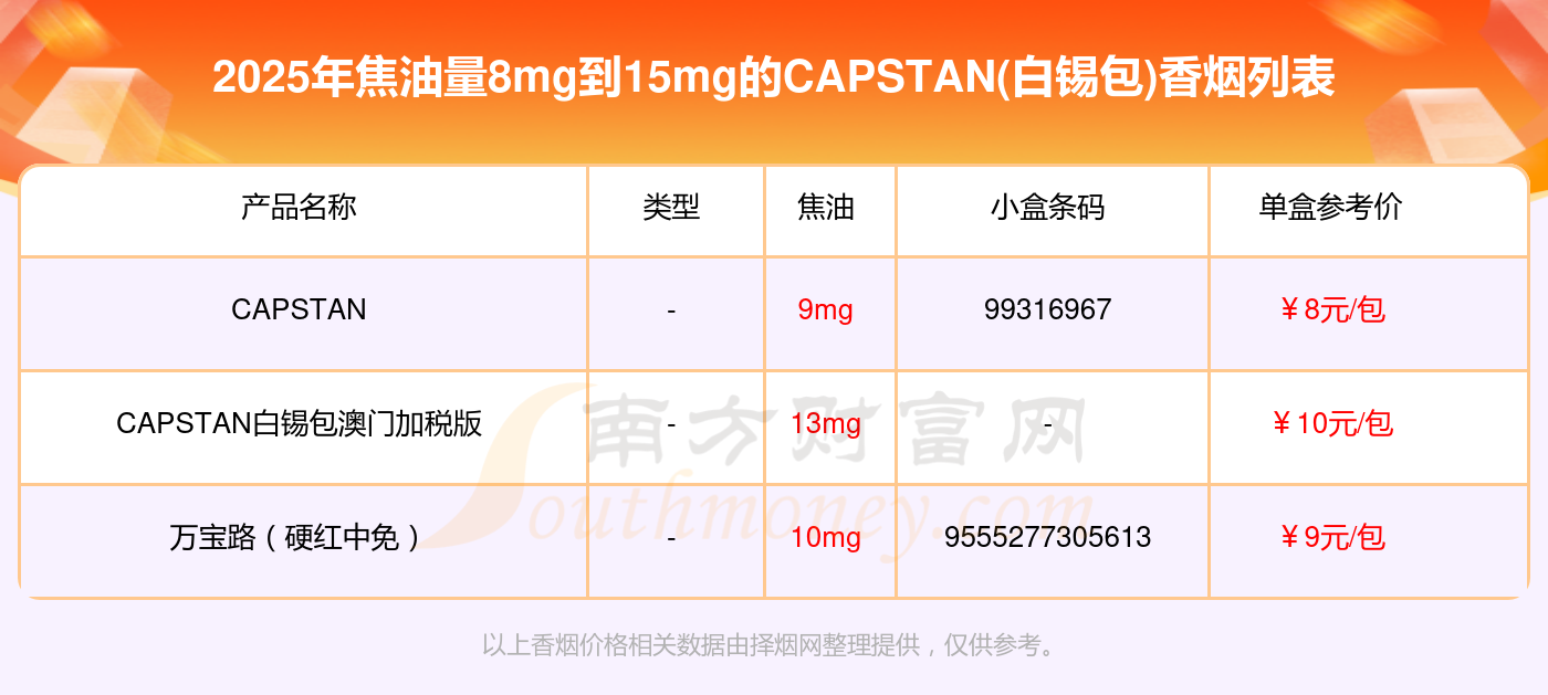 擇煙網(wǎng)為大家盤點了CAPSTAN(白錫包)香煙焦油量8mg到15mg的,分別有CAPSTAN、CAPSTAN白錫包澳門加稅版、萬寶路(硬紅中免)等,具體價格如下: