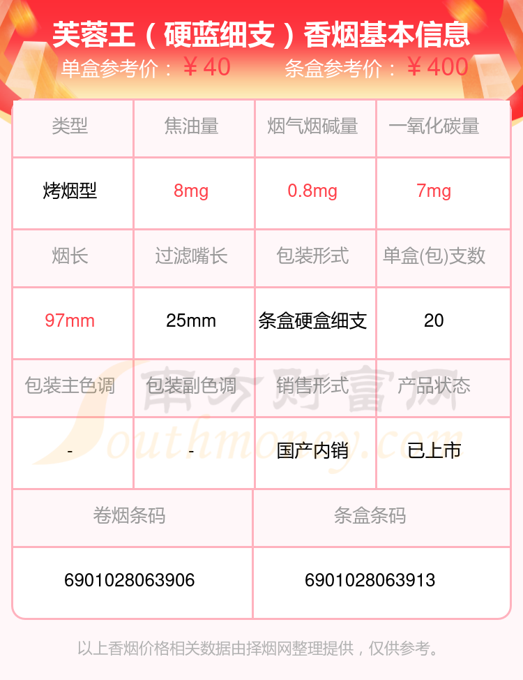 芙蓉王(硬藍(lán)細(xì)支)單盒參考價(jià):40元