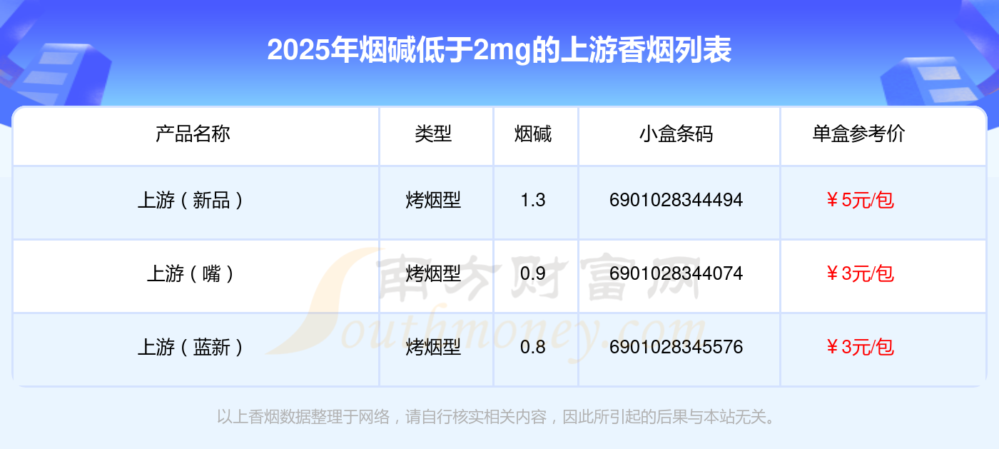 擇煙網(wǎng)為大家盤點了煙堿低于2mg的上游香煙,分別有上游(新品)、上游(嘴)、上游(藍新)等,具體價格如下: