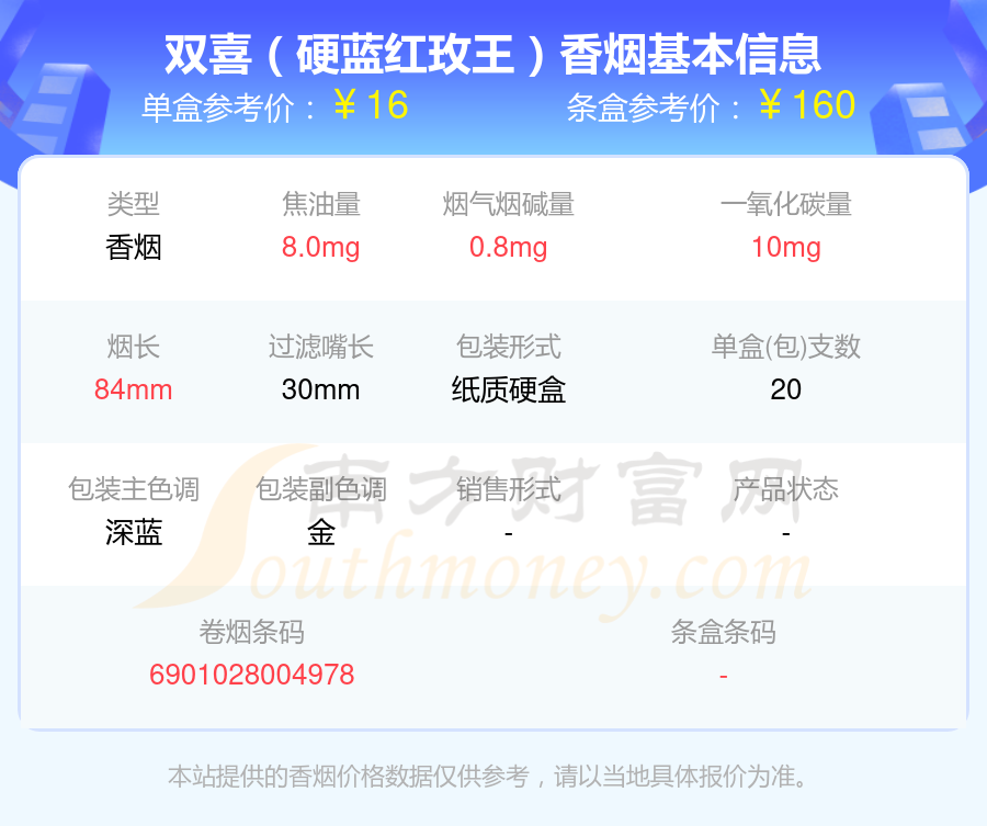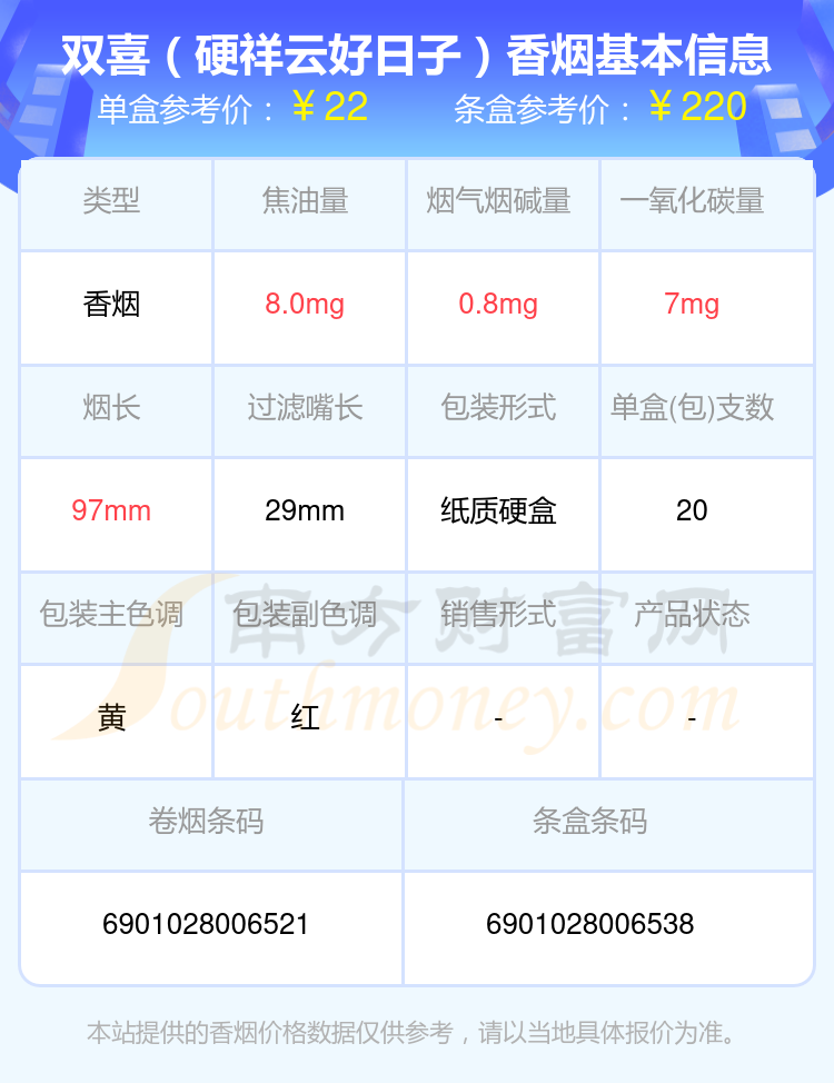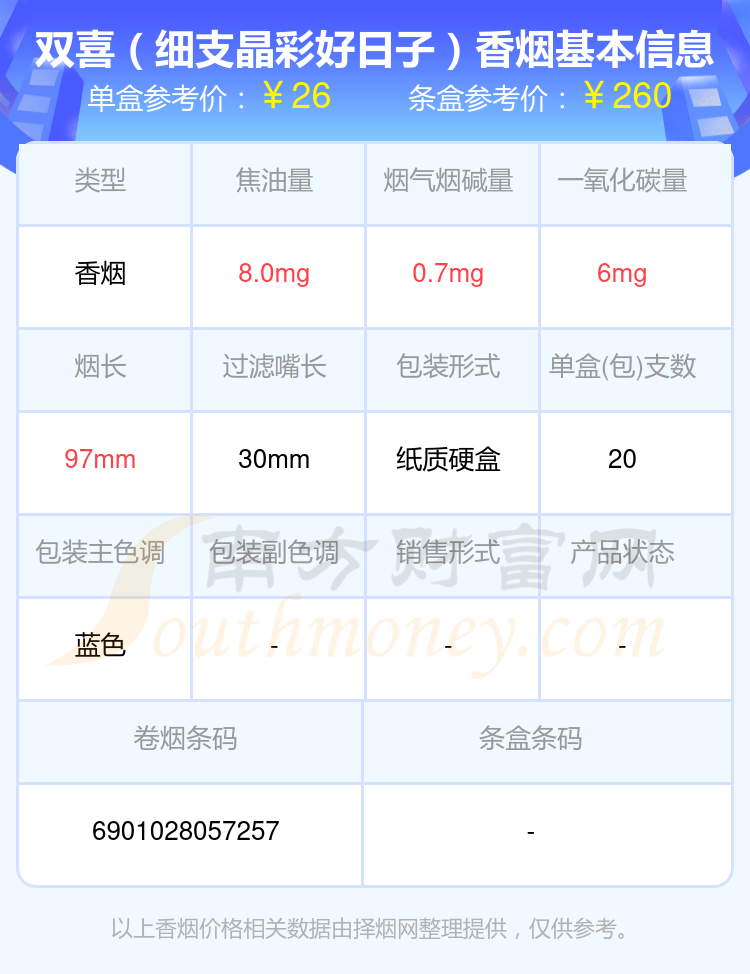 雙喜香煙焦油量8mg~15mg的煙有哪些?擇煙網(wǎng)為大家整理提供,分別有:雙喜(勿忘我)、雙喜(細(xì)支晶彩好日子)、雙喜(花悅)舊版、雙喜(花悅)、雙喜(硬祥云好日子)、雙喜(硬藍(lán)紅玫王)、雙喜(紅玫王軟藍(lán))、雙喜(傳奇)老版、雙喜(春天細(xì)支)、雙喜(硬紅逸品)等,具體價(jià)格如下: