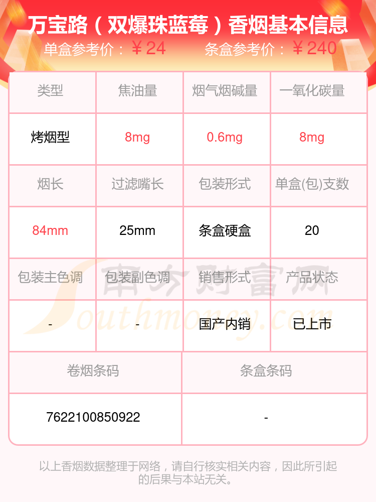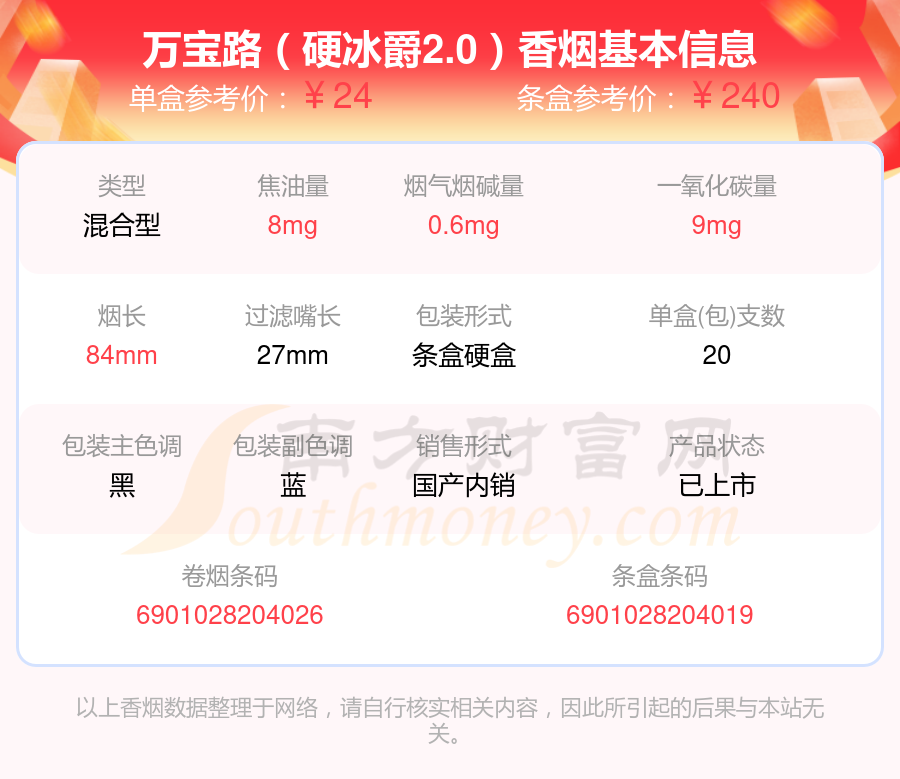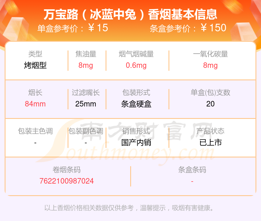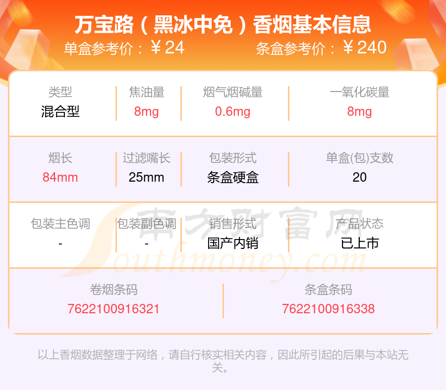 萬寶路(硬紅中兔)參考價9元/包、萬寶路(軟紅2.0)參考價16元/包、萬寶路(雙爆珠藍(lán)莓)參考價24元/包、萬寶路(雙爆珠橙味)參考價24元/包、萬寶路(冰藍(lán)中兔)參考價15元/包、萬寶路(硬冰爵2.0)參考價24元/包、萬寶路(黑冰中免)參考價24元/包、萬寶路(薄荷脆中免)參考價18元/包、萬寶路(硬綠)參考價12元/包、萬寶路(黑睿)參考價38元/包等。