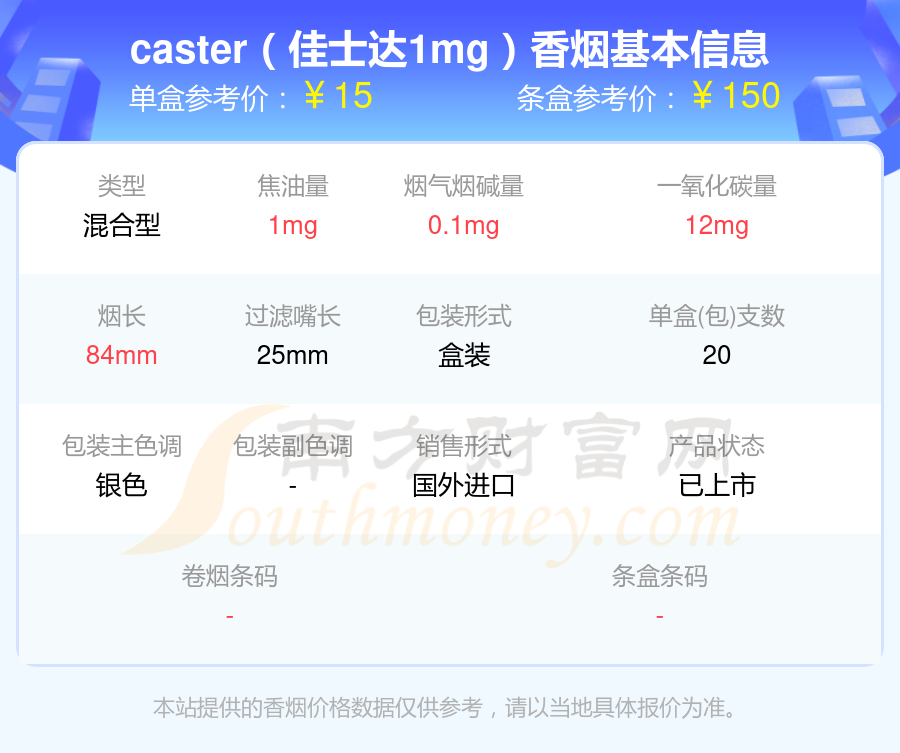 佳士達(dá)(原味)參考價15元/包、日免caster(7mg)參考價25元/包、佳士達(dá)(紅)參考價13元/包、佳士達(dá)(紅中免)參考價13元/包、佳士達(dá)(硬紅)參考價15元/包、佳士達(dá)(黃)參考價12元/包、caster(佳士達(dá)1mg)參考價15元/包等。