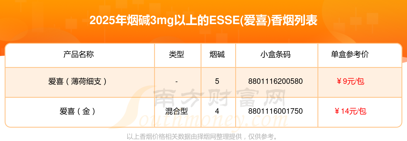 ESSE(愛(ài)喜)香煙煙堿3mg以上的煙有愛(ài)喜(薄荷細(xì)支)、愛(ài)喜(金)等,具體價(jià)格如下: