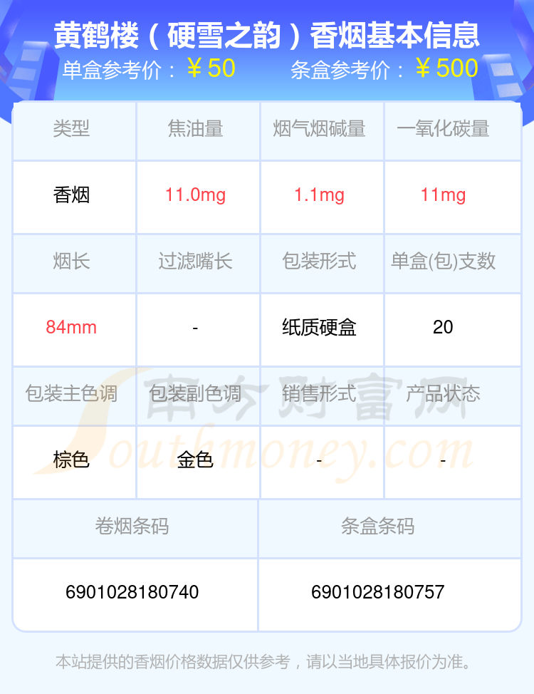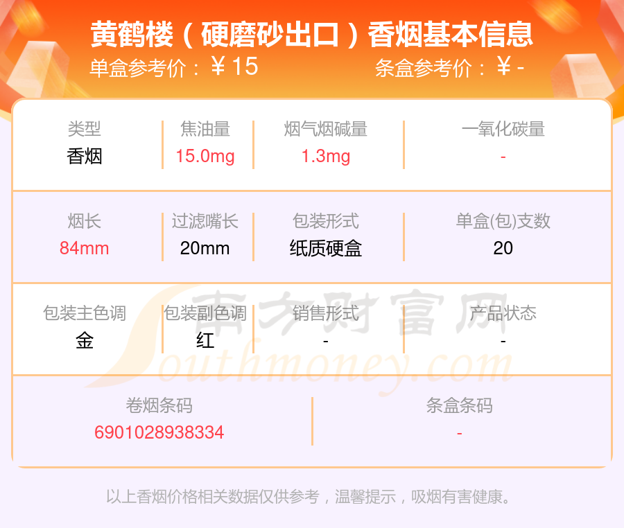 黃鶴樓(硬磨砂出口)參考價(jià)15.0元/包、黃鶴樓(硬金砂)參考價(jià)15.0元/包、黃鶴樓(硬雪之韻)參考價(jià)50.0元/包、黃鶴樓(軟長(zhǎng)論道)參考價(jià)33.0元/包、黃鶴樓(雅香紅硬)參考價(jià)20.0元/包、黃鶴樓(硬藍(lán))參考價(jià)20.0元/包、黃鶴樓(南洋叁號(hào))參考價(jià)15.0元/包、黃鶴樓(硬金砂龍煙)參考價(jià)15.0元/包、黃鶴樓(軟雅香·憶恩)參考價(jià)26.0元/包、黃鶴樓(軟藍(lán))出口版參考價(jià)19.0元/包等。