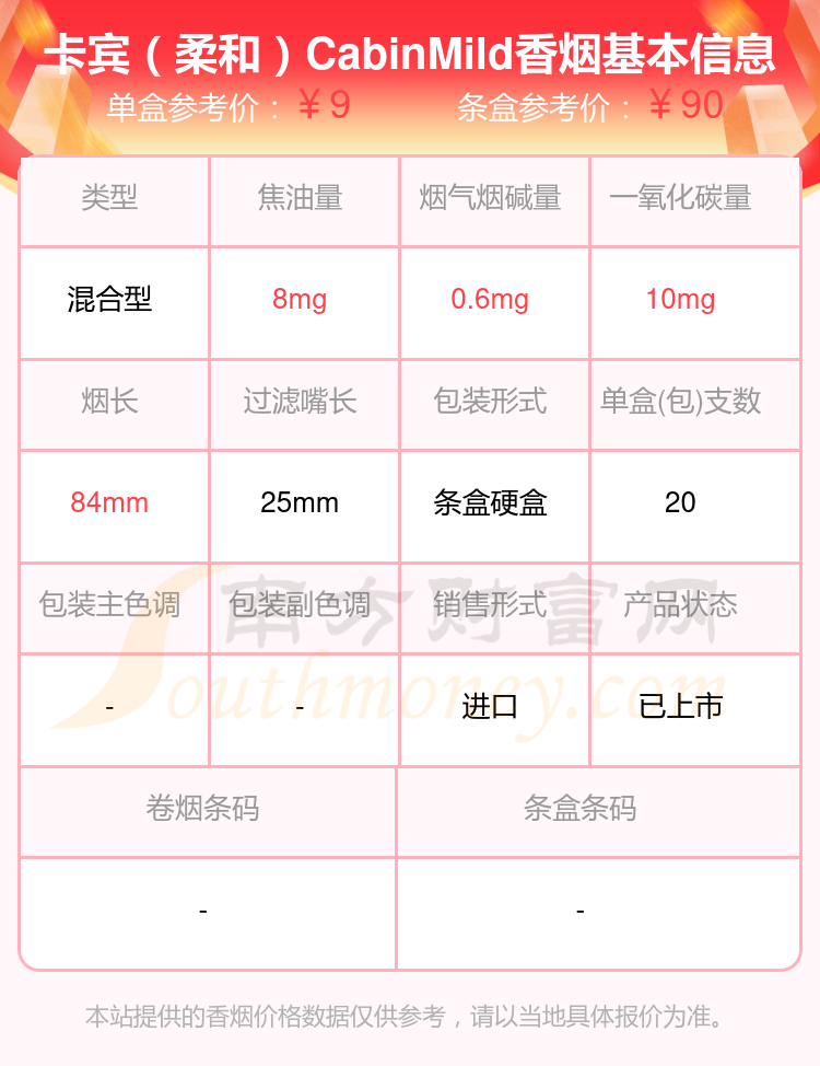 焦油量低于8mg的CABIN(卡賓)香煙有哪些?擇煙網(wǎng)為大家整理盤點(diǎn),有卡賓(紅中免)、卡賓(柔和)CabinMild等,詳細(xì)價(jià)格如下: