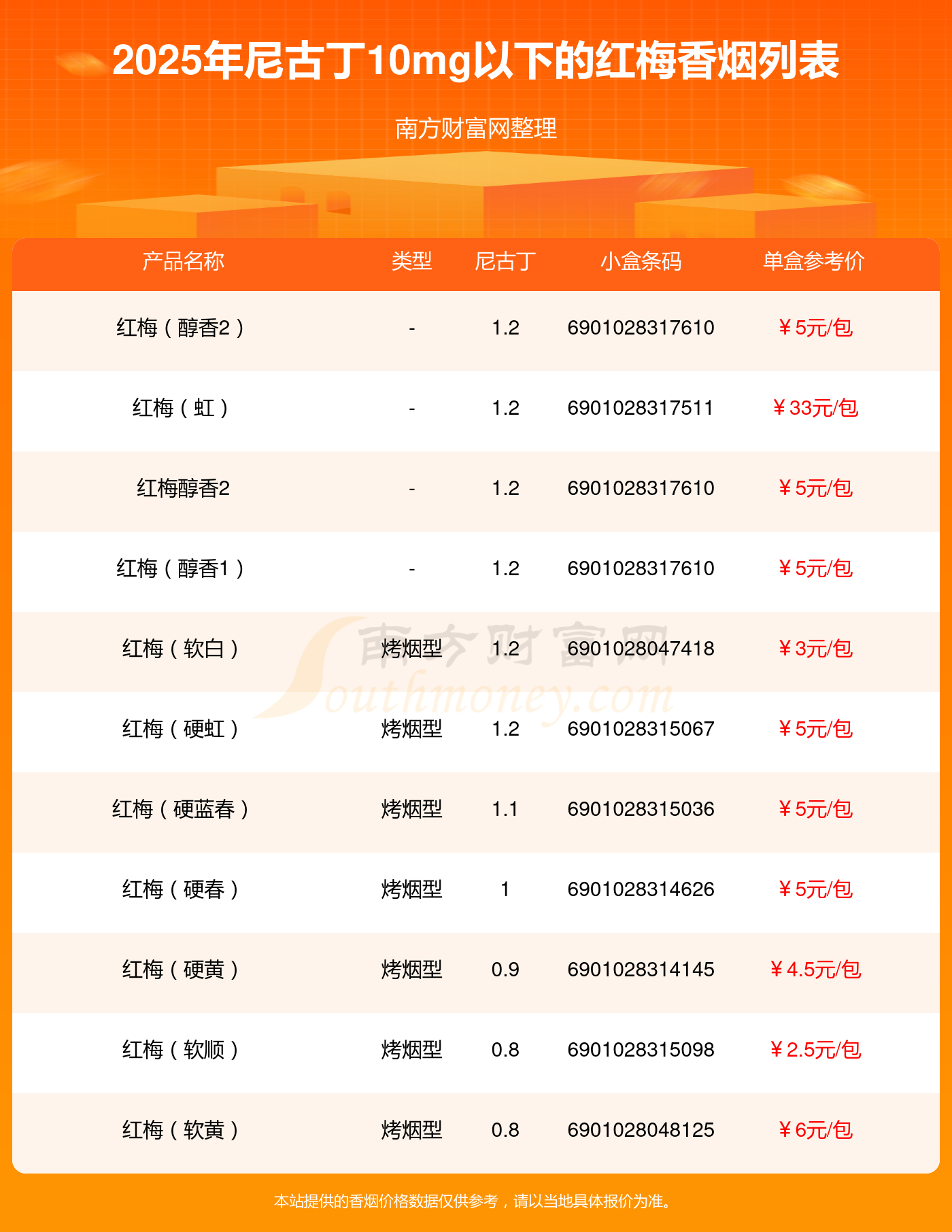 紅梅香煙尼古丁10mg以下的有哪些?擇煙網(wǎng)為大家整理提供,分別有: