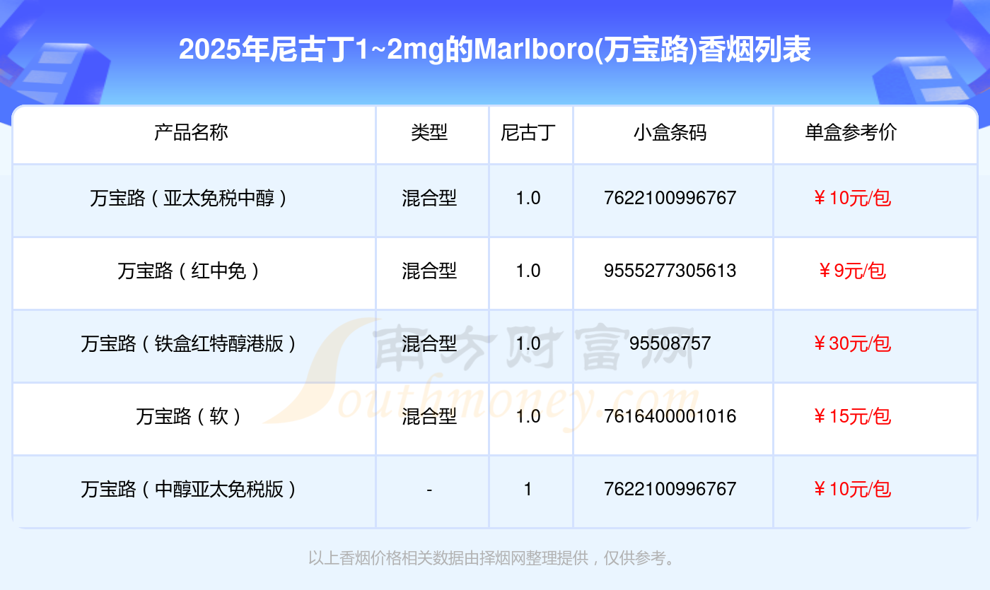 萬寶路(亞太免稅中醇)參考價10.0元/包、萬寶路(紅中免)參考價9.0元/包、萬寶路(鐵盒紅特醇港版)參考價30.0元/包、萬寶路(軟)參考價15.0元/包、萬寶路(中醇亞太免稅版)參考價10元/包等。