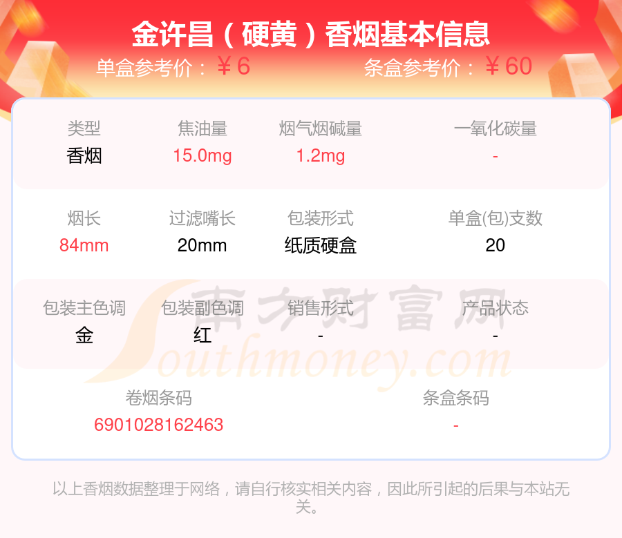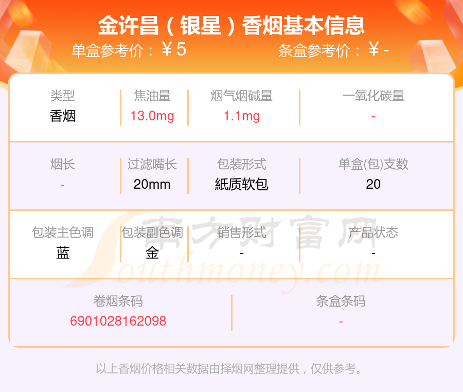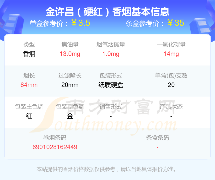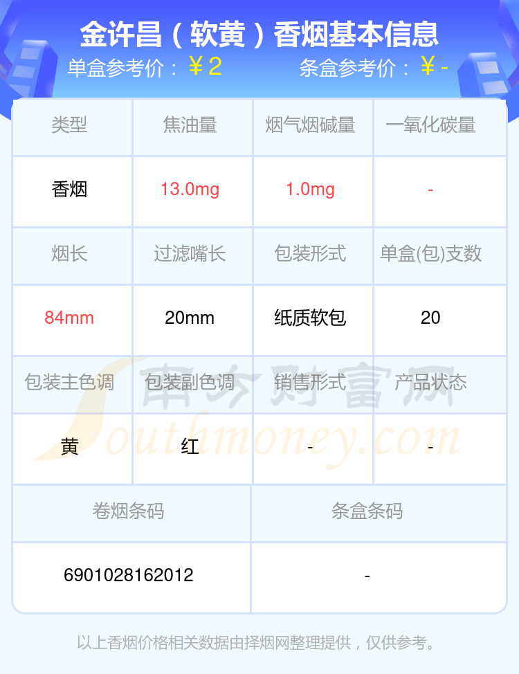 金許昌(硬黃)參考價6.0元/包、金許昌(銀星)參考價5.0元/包、金許昌(硬紅)參考價3.5元/包、金許昌(軟黃)參考價2.0元/包、金許昌(軟紅)參考價2.5元/包等。