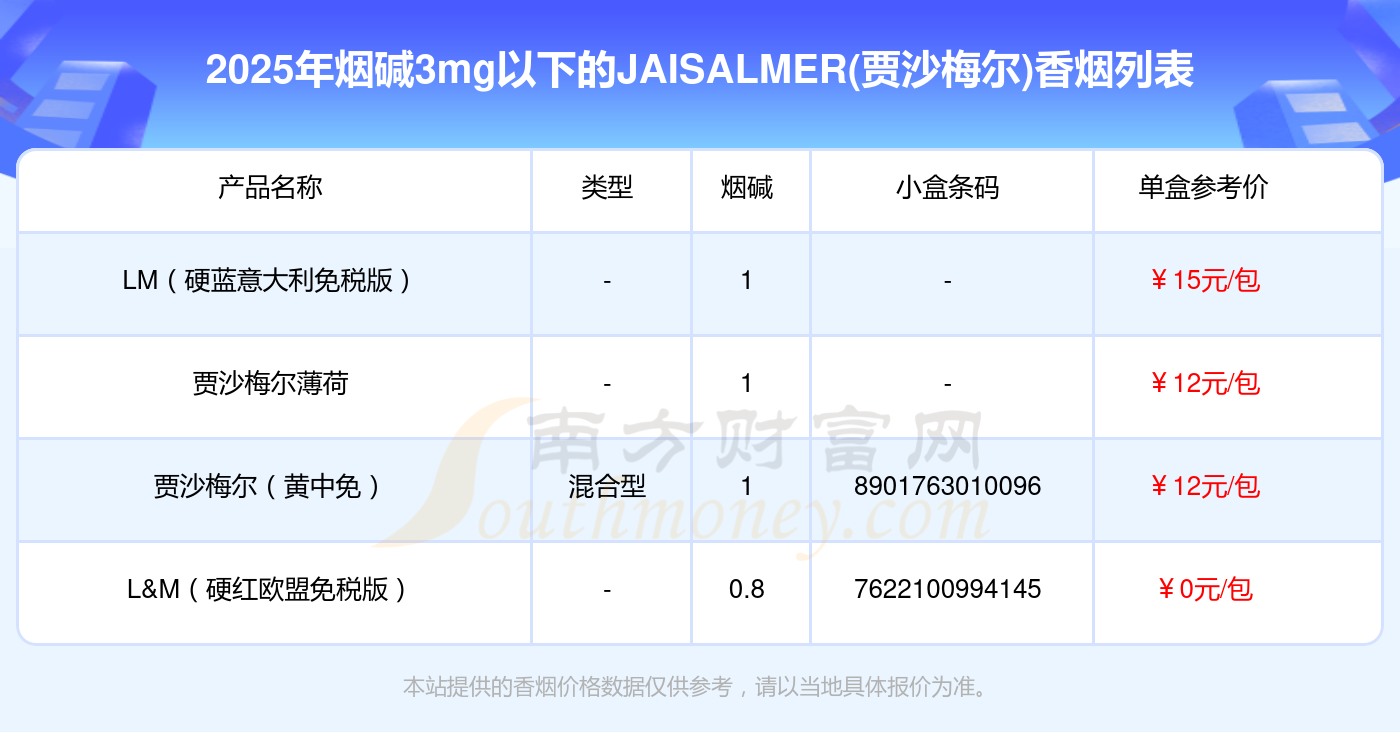 煙堿3mg以下的JAISALMER(賈沙梅爾)香煙有哪些?擇煙網(wǎng)為大家整理盤點,分別有:LM(硬藍意大利免稅版)、賈沙梅爾薄荷、賈沙梅爾(黃中免)、L&M(硬紅歐盟免稅版)等,具體價格如下: