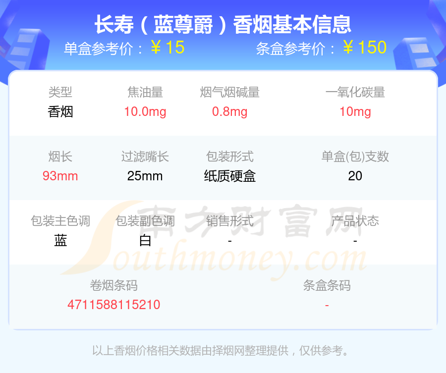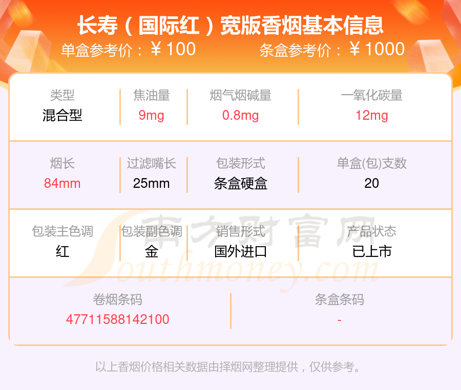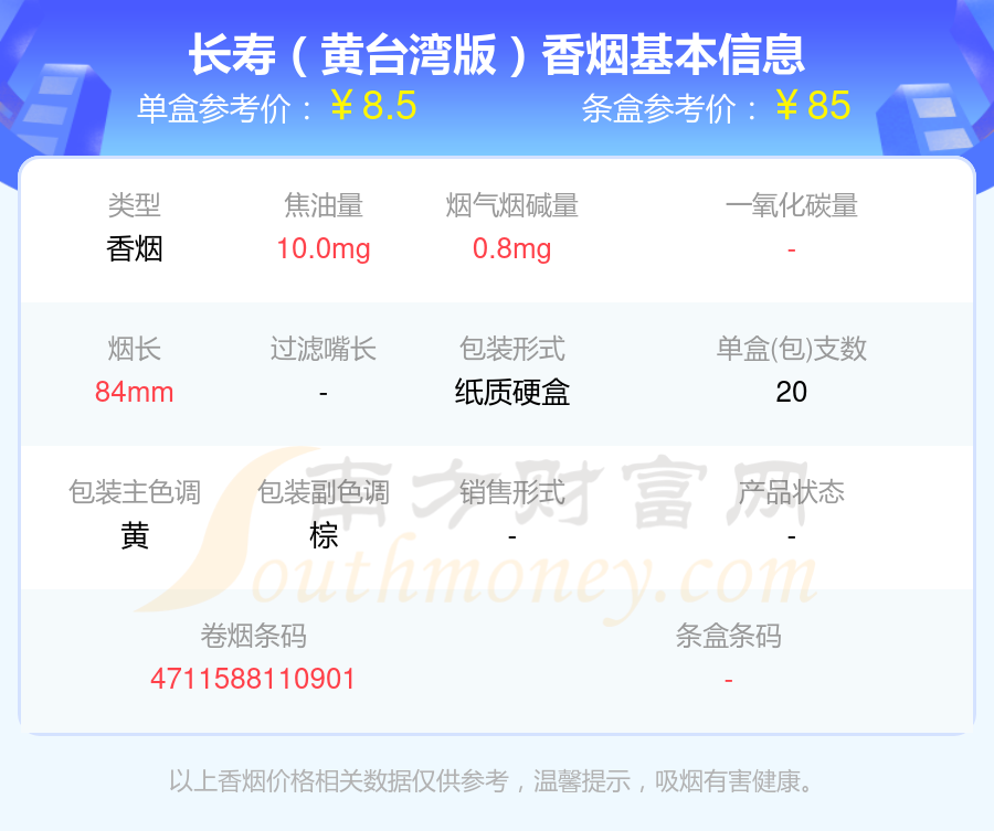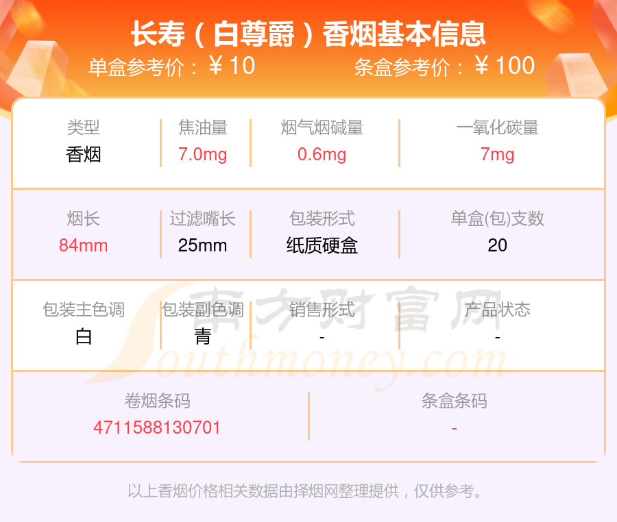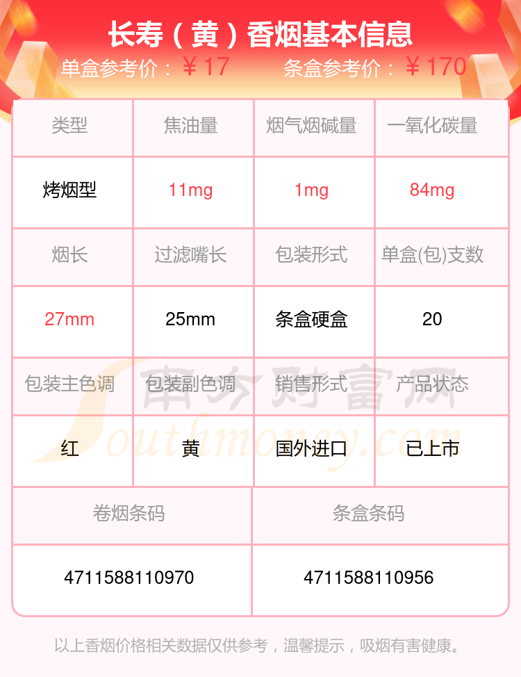 長(zhǎng)壽(黃)參考價(jià)17元/包、長(zhǎng)壽(兩岸)參考價(jià)11元/包、尊爵(白金晶鉆國(guó)際)參考價(jià)34.5元/包、長(zhǎng)壽(國(guó)際紅)寬版參考價(jià)100元/包、長(zhǎng)壽(黃臺(tái)灣版)參考價(jià)8.5元/包、長(zhǎng)壽(藍(lán)尊爵)參考價(jià)15.0元/包、長(zhǎng)壽(尊爵10號(hào))參考價(jià)15元/包、尊爵(G7)參考價(jià)17.0元/包、長(zhǎng)壽(白尊爵)參考價(jià)10.0元/包、長(zhǎng)壽(白尊爵)新版參考價(jià)17.0元/包等。