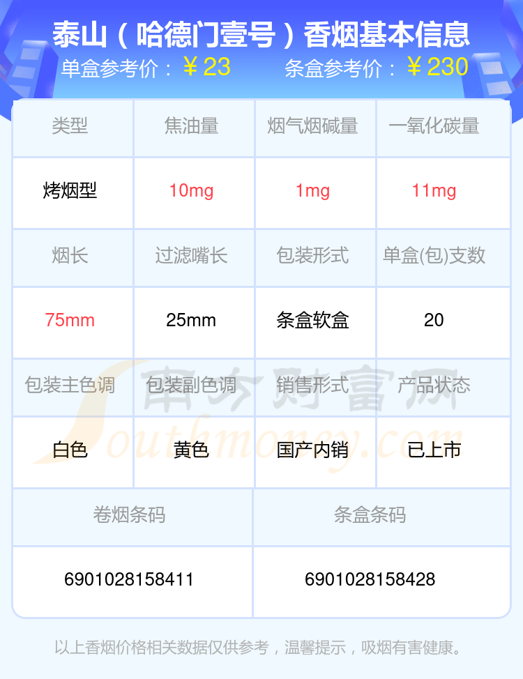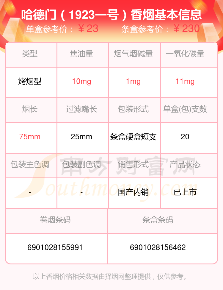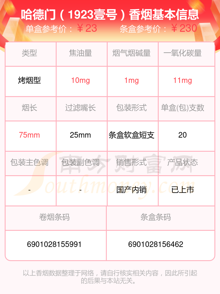 哈德門香煙煙堿量低于1mg的煙分別有哈德門(軟)參考價(jià)5.0元/包、哈德門(精品)參考價(jià)4.0元/包、哈德門(1923一號(hào))參考價(jià)23元/包、哈德門(1923壹號(hào))參考價(jià)23元/包、泰山(哈德門壹號(hào))參考價(jià)23元/包、哈德門(壹號(hào))參考價(jià)23元/包、哈德門(芬芳)參考價(jià)4.5元/包、哈德門(純香)參考價(jià)6.0元/包、哈德門(金典)參考價(jià)5元/包等。