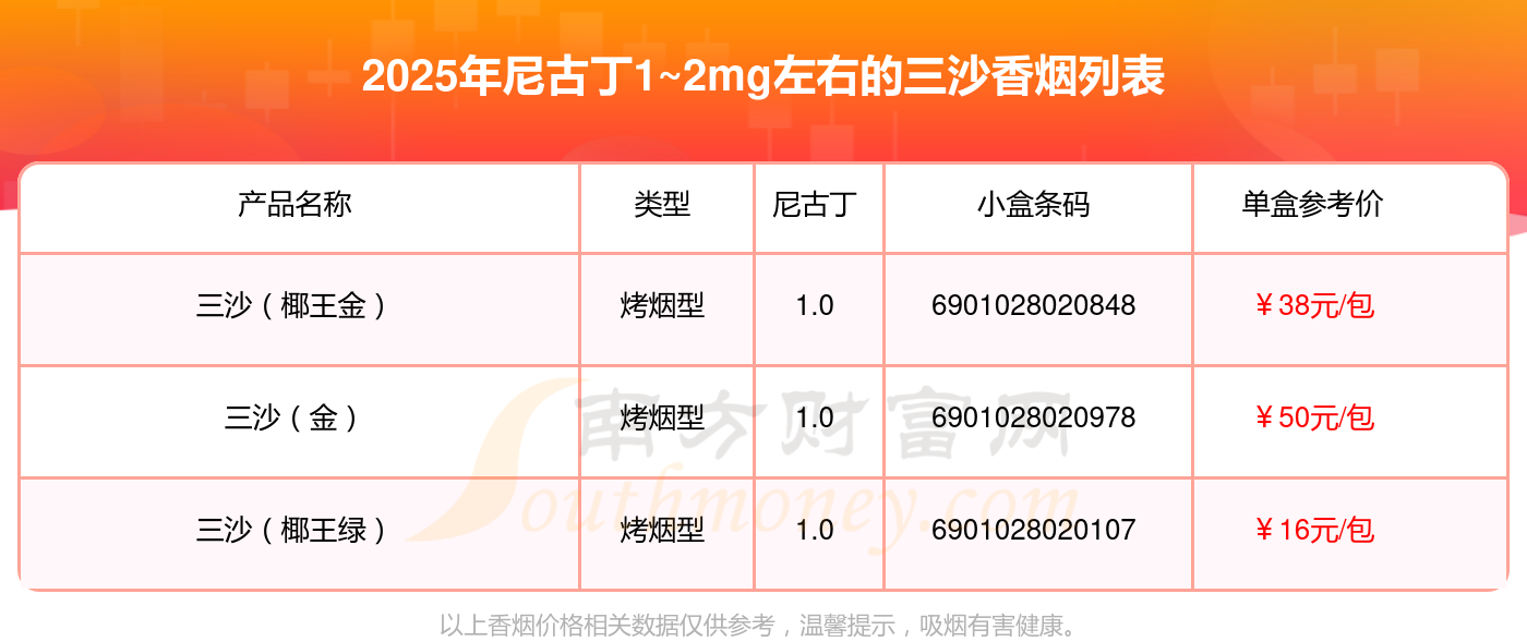 三沙香煙尼古丁1~2mg左右的煙有哪些?擇煙網(wǎng)為大家整理提供,分別有:三沙(椰王金)、三沙(金)、三沙(椰王綠)等,具體價格如下: