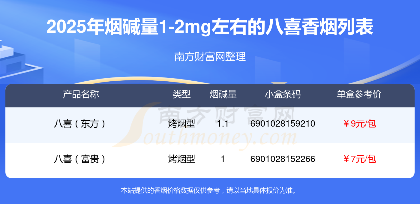 擇煙網(wǎng)為大家盤點(diǎn)了煙堿量1-2mg左右的八喜香煙,有八喜(東方)、八喜(富貴)等,詳細(xì)價格如下: