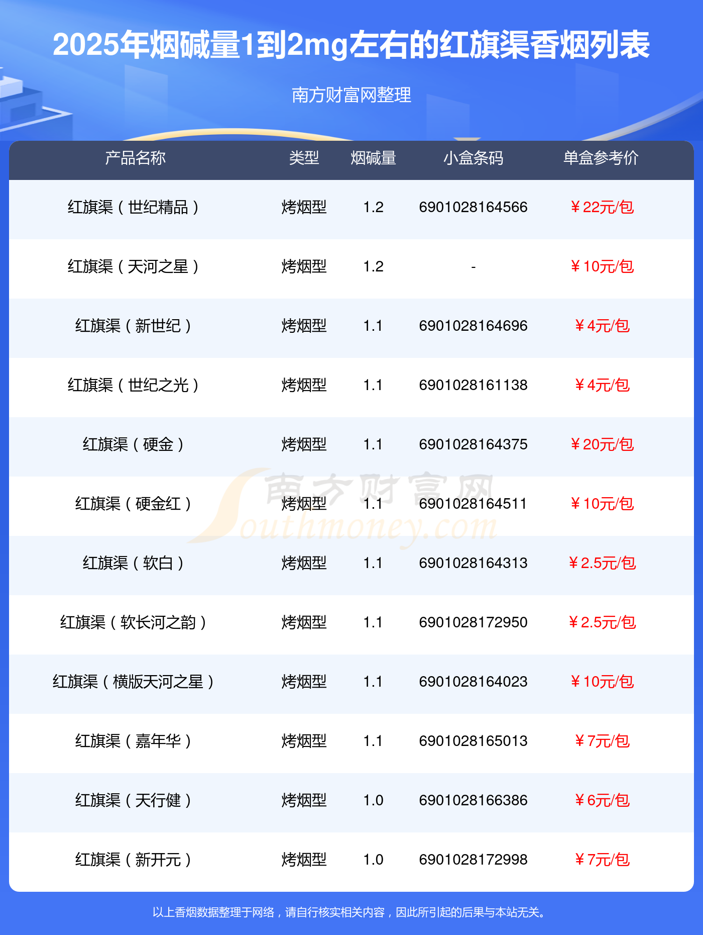 煙堿量1到2mg左右的紅旗渠香煙有哪些?擇煙網(wǎng)為大家整理盤點(diǎn),分別有:紅旗渠(世紀(jì)精品)、紅旗渠(天河之星)、紅旗渠(新世紀(jì))、紅旗渠(世紀(jì)之光)、紅旗渠(硬金)、紅旗渠(硬金紅)、紅旗渠(軟白)、紅旗渠(軟長(zhǎng)河之韻)、紅旗渠(橫版天河之星)、紅旗渠(嘉年華)等,具體價(jià)格如下: