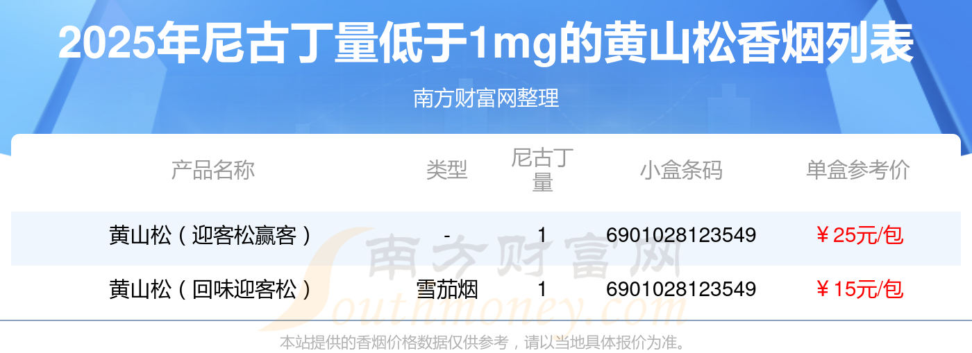 黃山松香煙尼古丁量低于1mg的煙有黃山松(迎客松贏客)、黃山松(回味迎客松)等,詳細(xì)價(jià)格如下:
