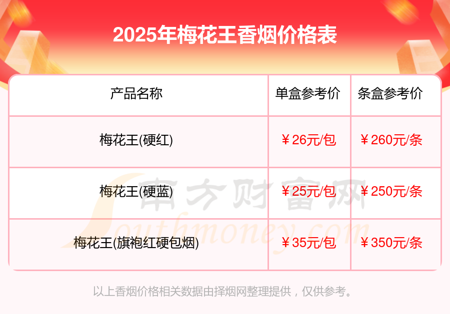 2025梅花王香煙最新價格:梅花王(旗袍紅硬包煙)參考價35.0元/包、梅花王(硬紅)參考價26.0元/包、梅花王(硬藍(lán))參考價25.0元/包。