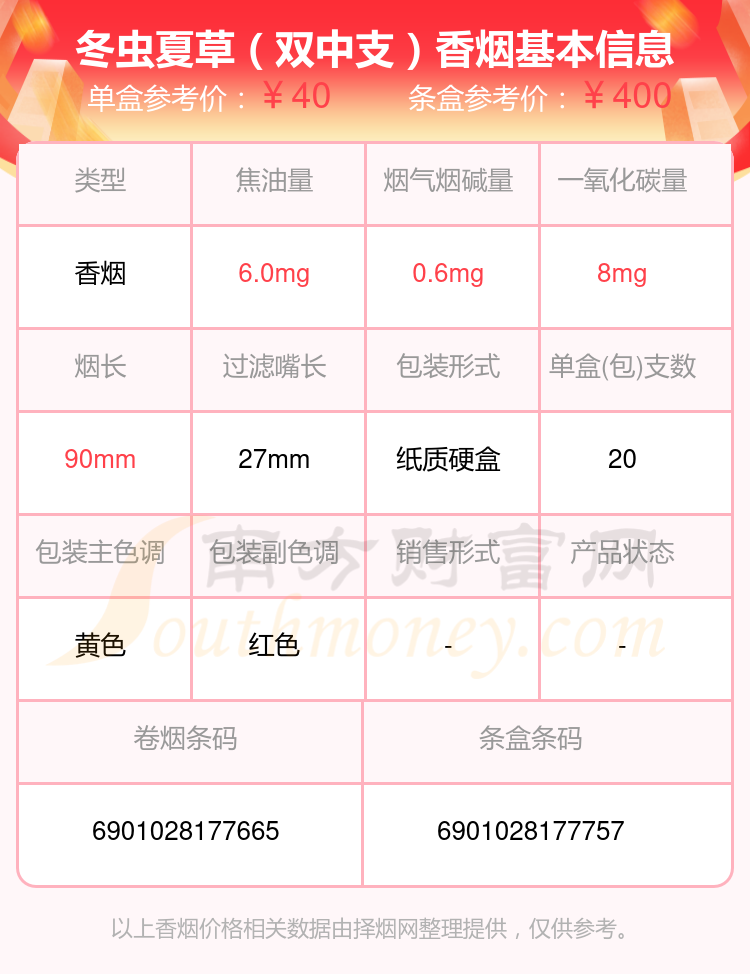 冬蟲(chóng)夏草香煙30~40元的煙有哪些?擇煙網(wǎng)為大家整理提供,分別有:冬蟲(chóng)夏草(雙中支)、冬蟲(chóng)夏草(銀)、冬蟲(chóng)夏草(銀)、冬蟲(chóng)夏草(雙中支)硬盒等,具體價(jià)格如下: