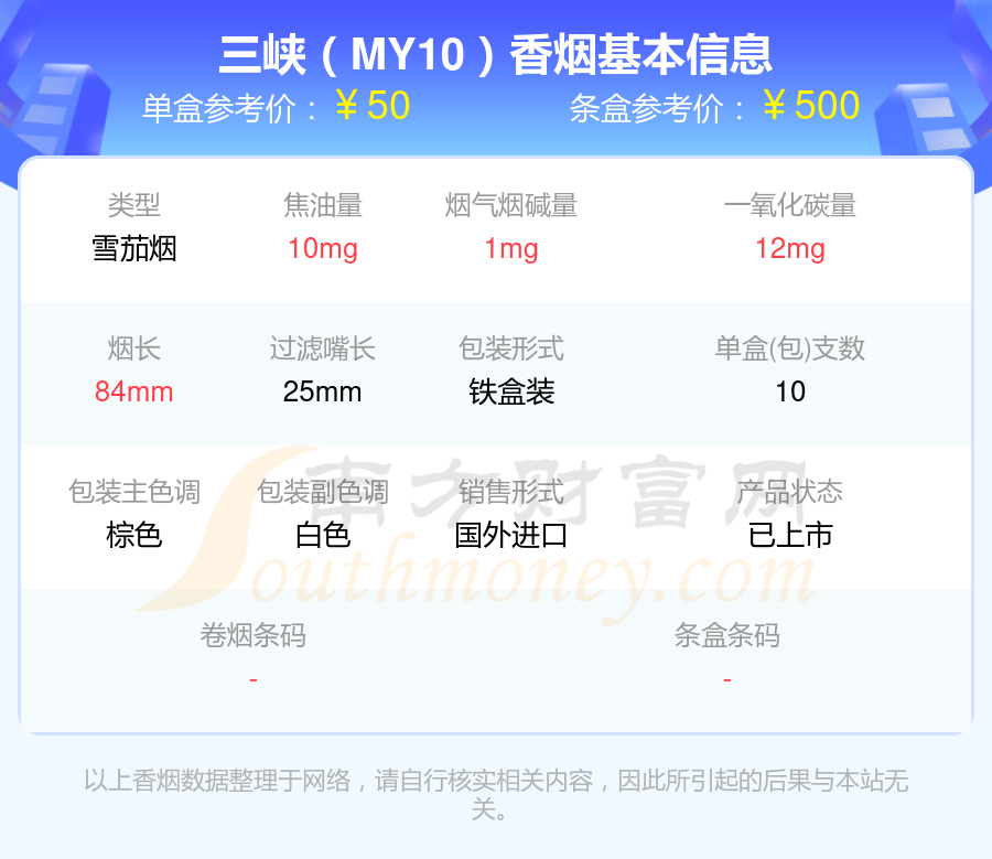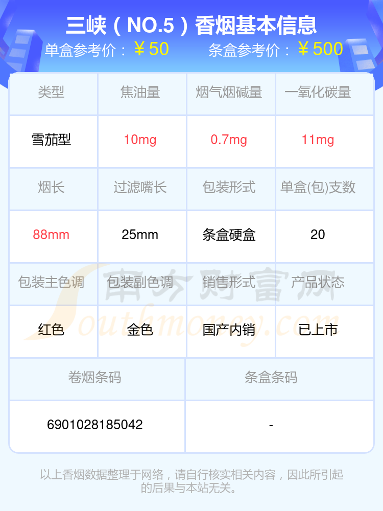 三峽(NO.5)參考價50元/包、三峽NO.5雪茄參考價50元/包、三峽(MY10)參考價50元/包、三峽(NO.4)參考價45元/包等。