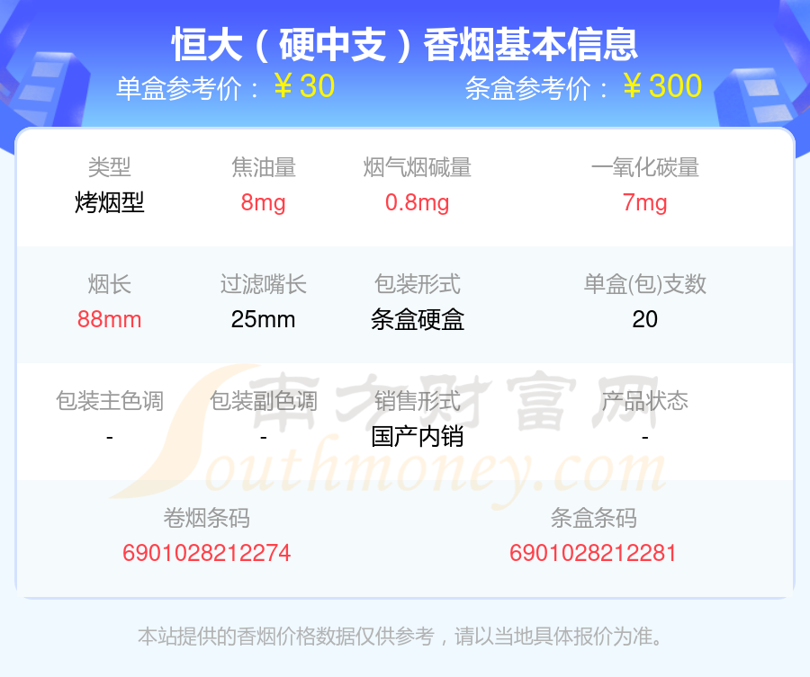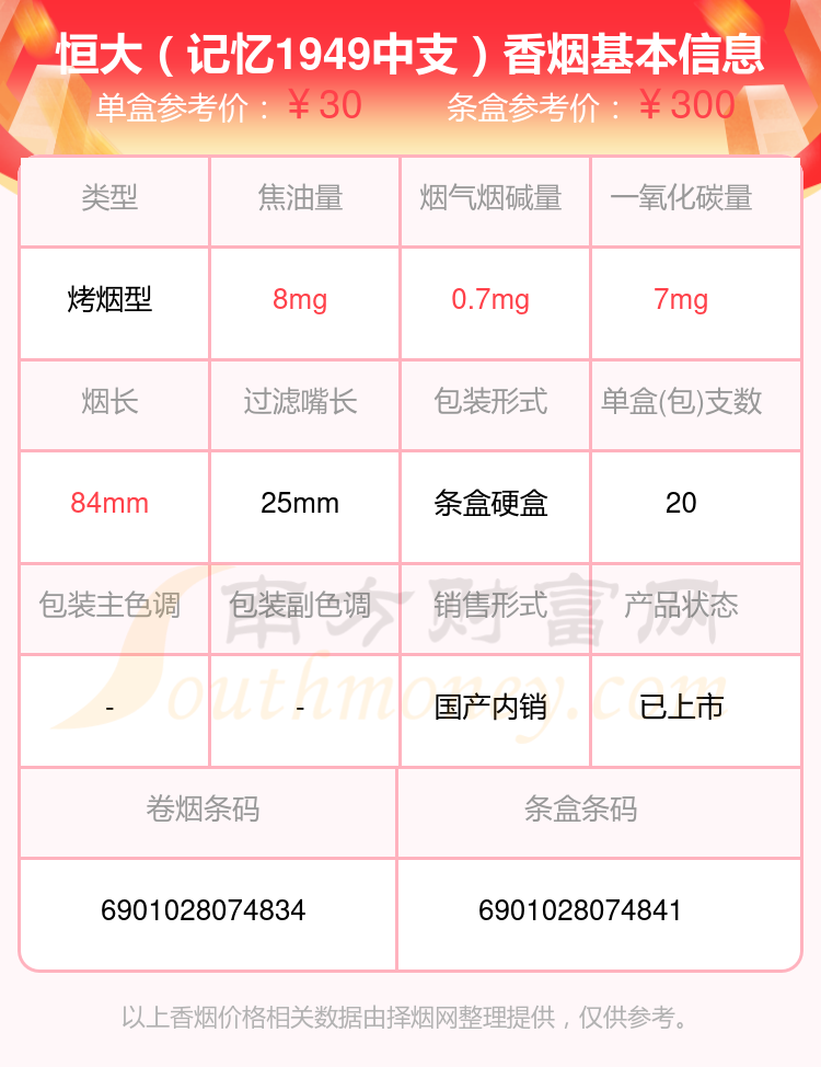 擇煙網(wǎng)為大家盤點了20元~50元左右的恒大香煙,分別有恒大(記憶1949中支)、恒大(硬中支)、恒大(記憶1949)等,具體價格如下: