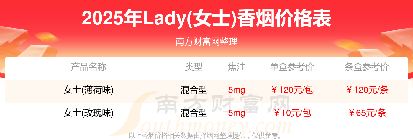 當前Lady(女士)價格最高的香煙為女士(薄荷味),參考價120.0元/包,而Lady(女士)香煙價格最低的是女士(玫瑰味),參考價10.0元/包,價格高低差為110元/包。