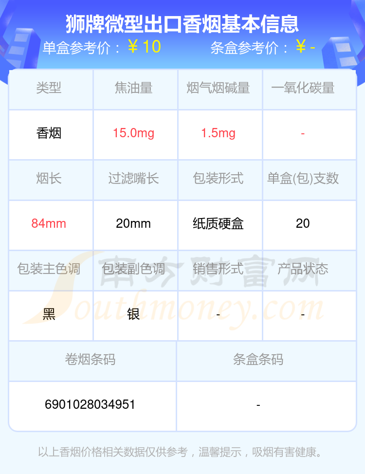 獅牌微型出口香煙網(wǎng)友評(píng)分:口味評(píng)分5分,外觀評(píng)分6.5分,性價(jià)比評(píng)分6.2分,綜合得分5.9分。