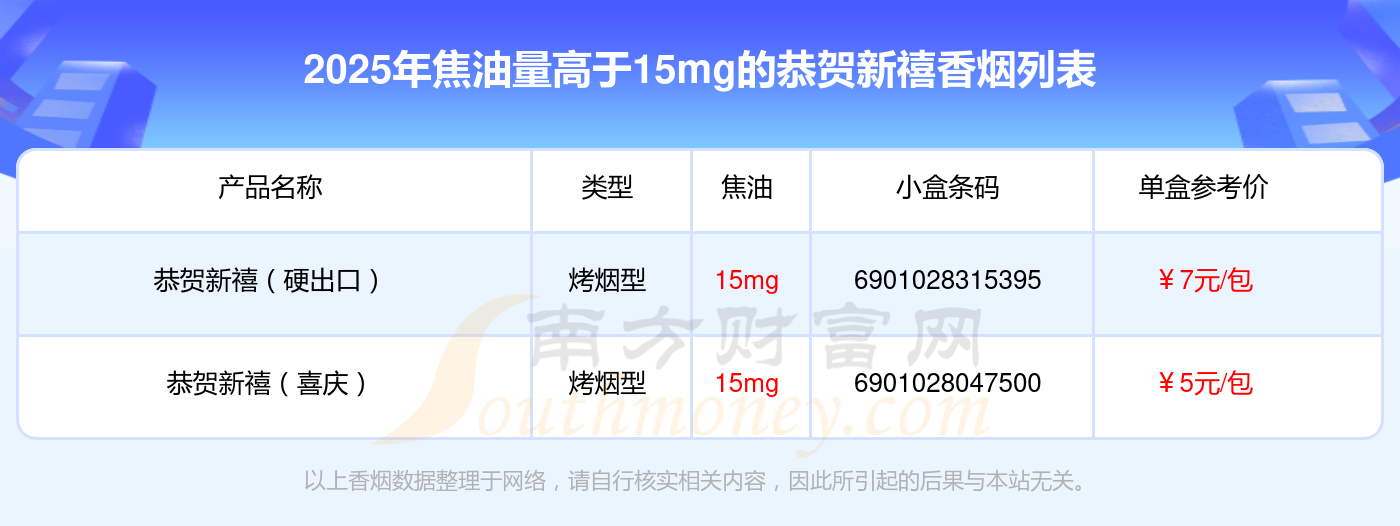 恭賀新禧香煙焦油量高于15mg的煙有恭賀新禧(硬出口)、恭賀新禧(喜慶)等,詳細(xì)價(jià)格如下: