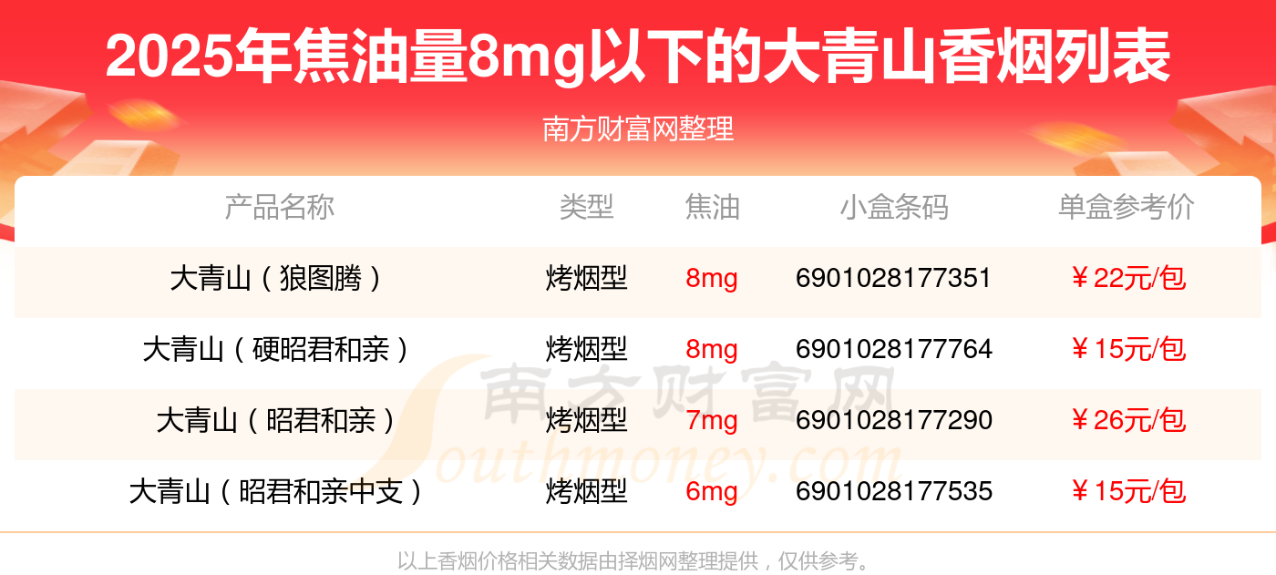 焦油量8mg以下的大青山香煙有哪些?擇煙網(wǎng)為大家整理盤點,有大青山(狼圖騰)、大青山(硬昭君和親)、大青山(昭君和親)、大青山(昭君和親中支)等,詳細(xì)價格如下: