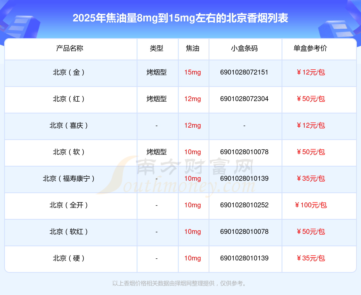 北京(金)參考價12元/包、北京(紅)參考價50元/包、北京(喜慶)參考價12元/包、北京(軟)參考價50.0元/包、北京(福壽康寧)參考價35元/包、北京(全開)參考價100元/包、北京(軟紅)參考價50元/包、北京(硬)參考價35元/包等。