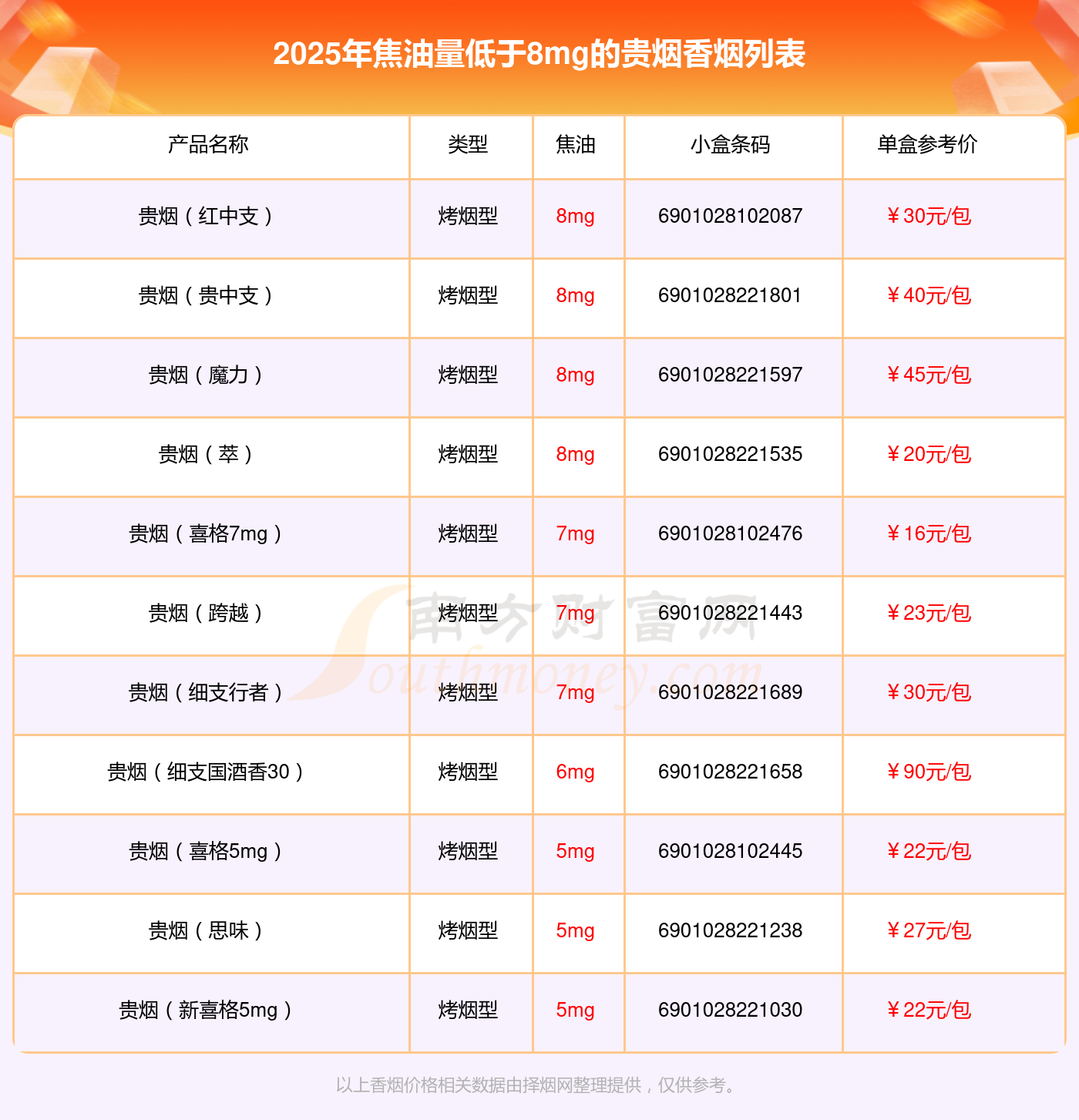 貴煙香煙焦油量低于8mg的有哪些?擇煙網(wǎng)為大家整理提供,分別有: